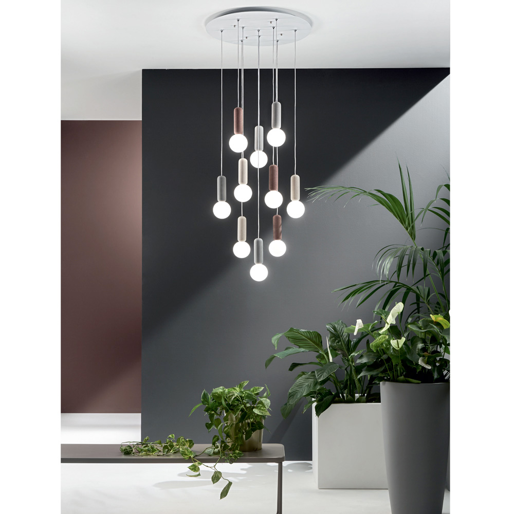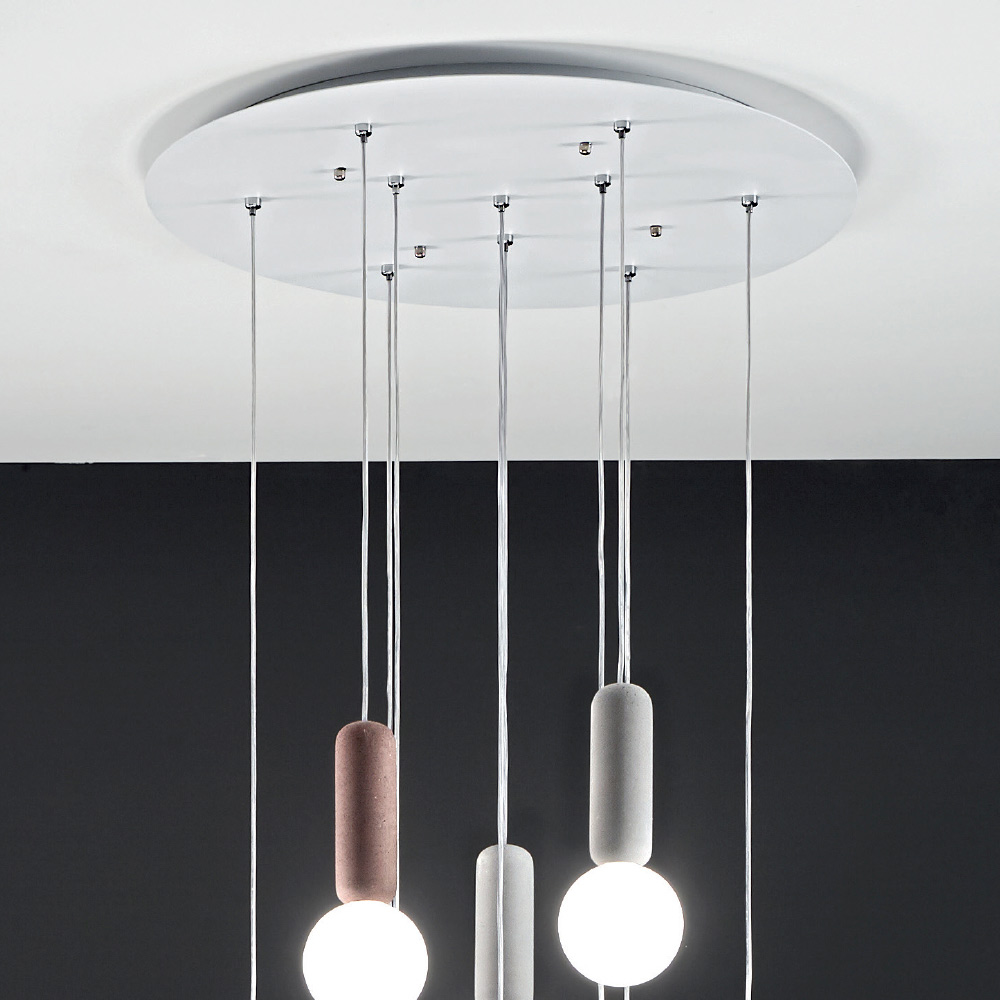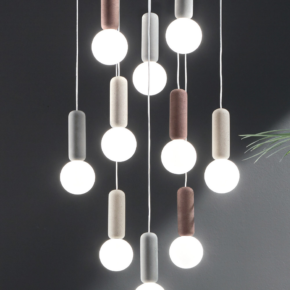cristal blanco satinado con cables regulables en longitud. Una combinación inusual y creativa de materiales y acabados que da vida a una solución de decoración tan excéntrica como elegante y moderna. Los maravillosos matices de color elegidos para los componentes de hormigón se combinan a la perfección con el delicado y romántico acabado de las pantallas de vidrio para un resultado con una