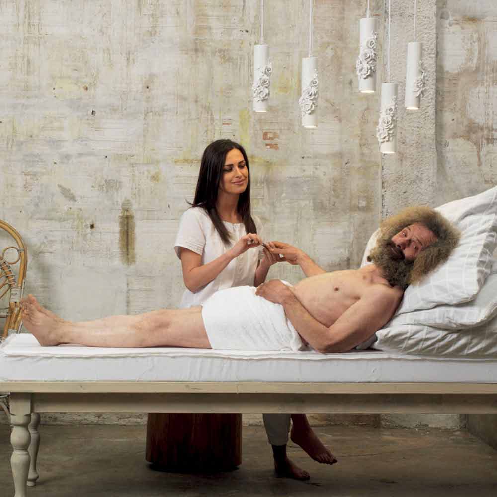 La lámpara está hecha de blanco opaco de cerámica como un material que representa el origen, la maleabilidad, la creación y que conduce directamente a los orígenes de nuestra cultura.