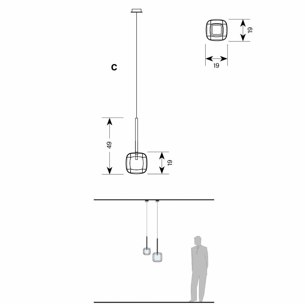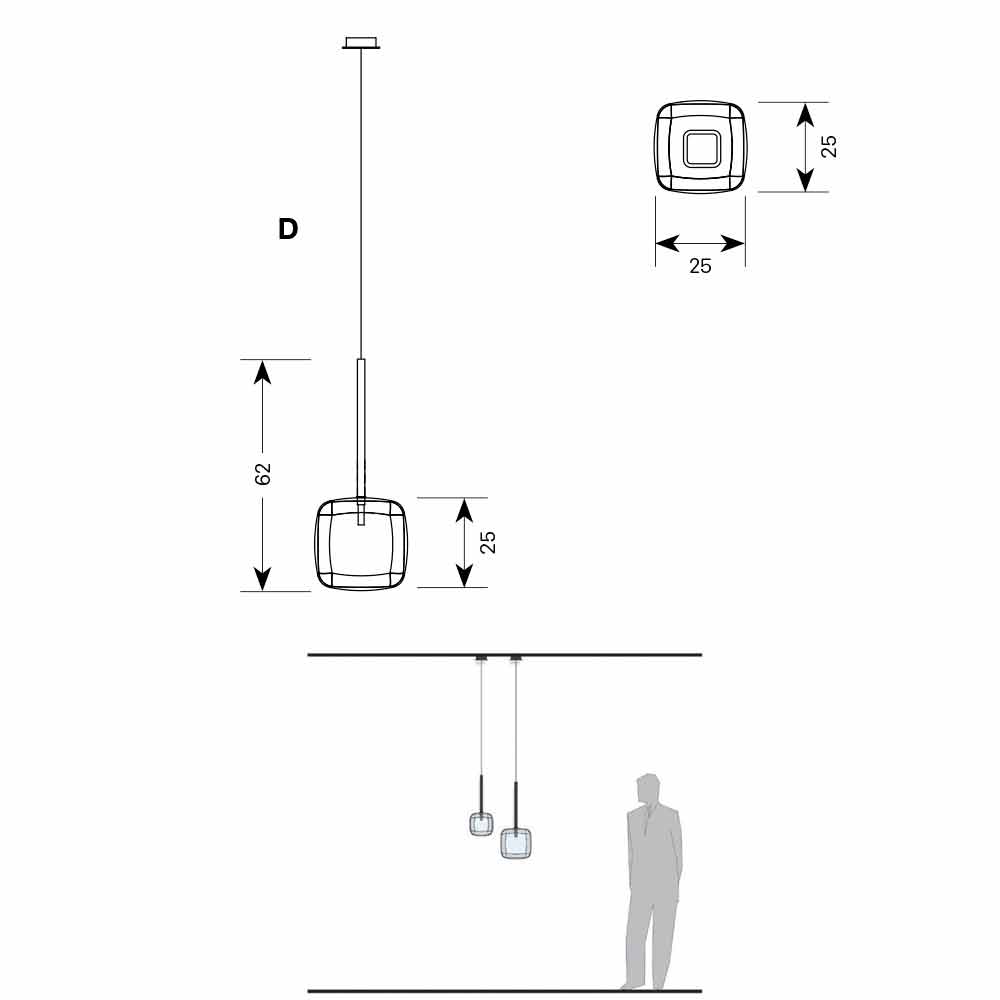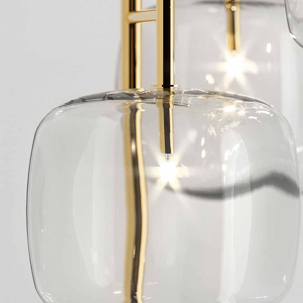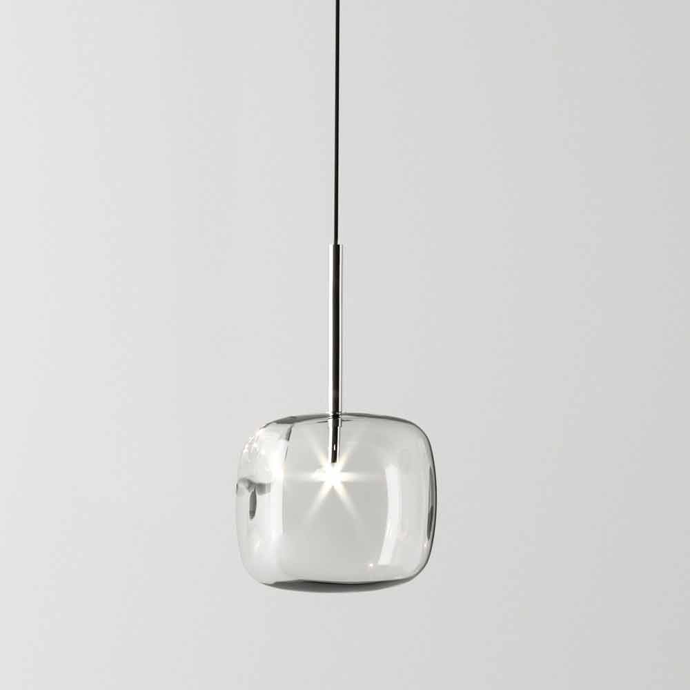 Lámpara colgante de diseño en metal pulido con cubo de cristal redondeado Made in Italy.