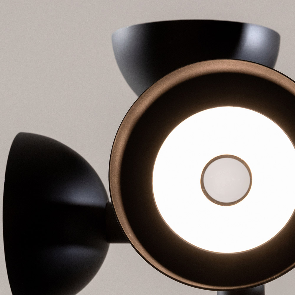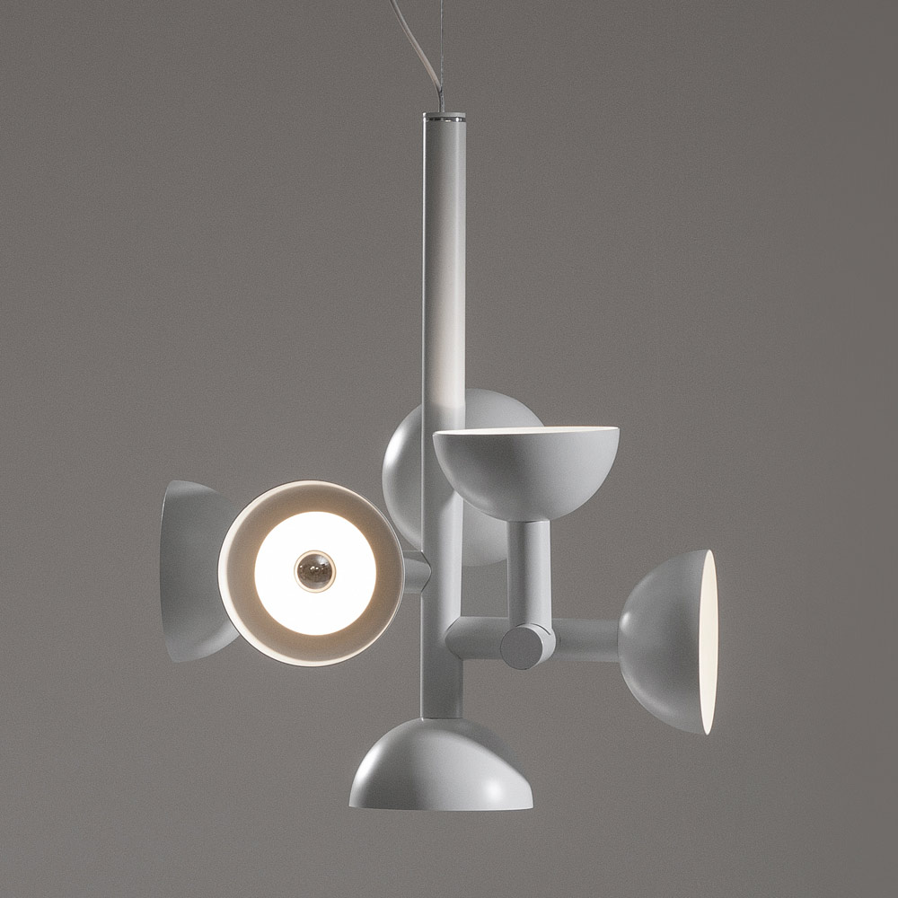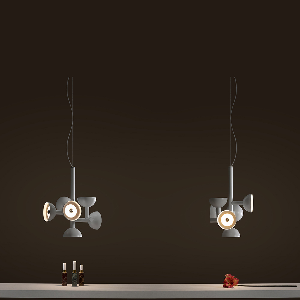 La lámpara está realizada con una estructura de aluminio de dos acabados para un diseño íntegramente italiano que, a través de la experimentación poco convencional y la búsqueda continua entre tradición y modernidad , es capaz de asombrar, atrever y emocionar, permitiéndote expresar tus emociones a través de un original y personal. uso decorativo de la luz.