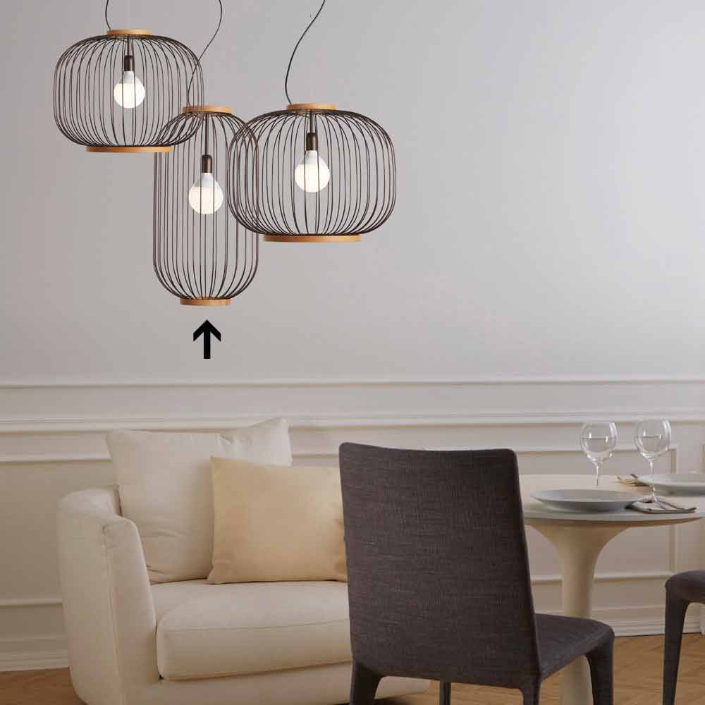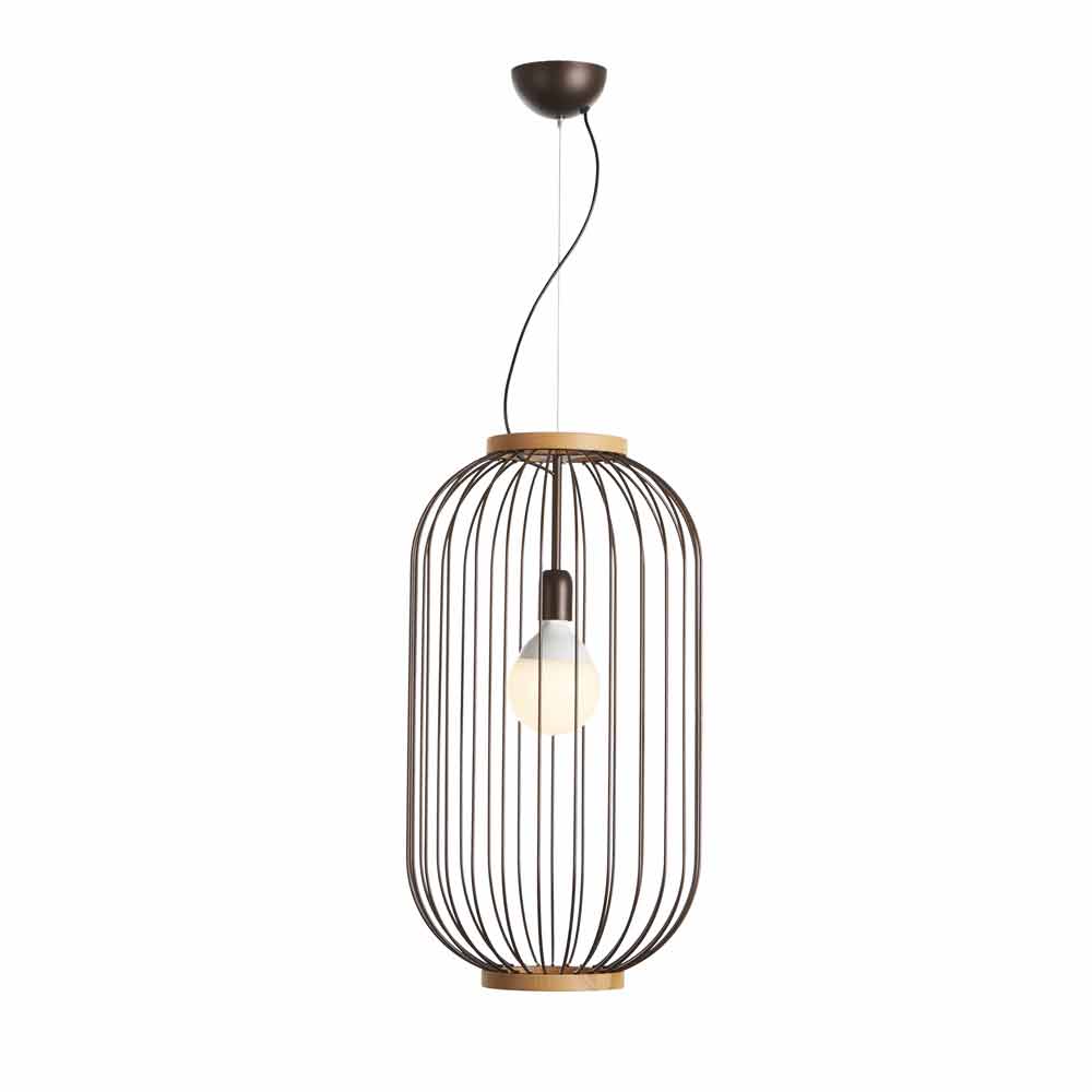 Lámpara de suspensión hecha de barra de acero con forma y pintada con polvos epoxi. Las dos bandas que cierran el cuerpo redondeado están hechas de madera natural.