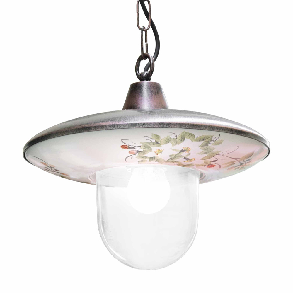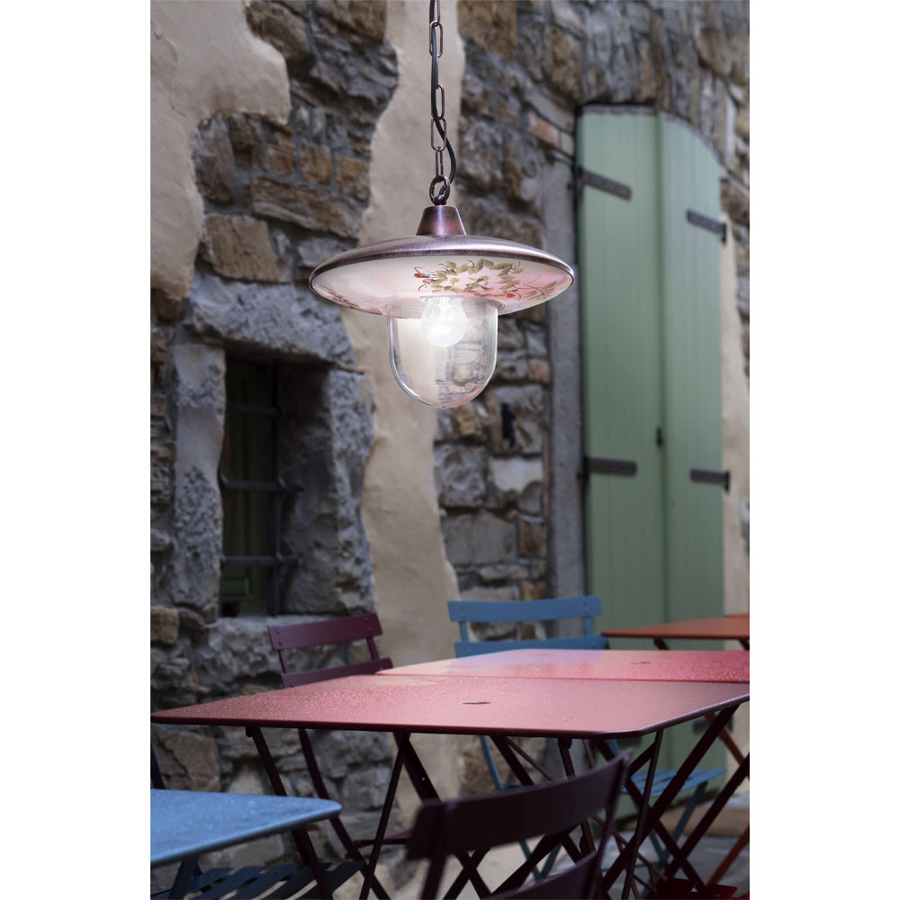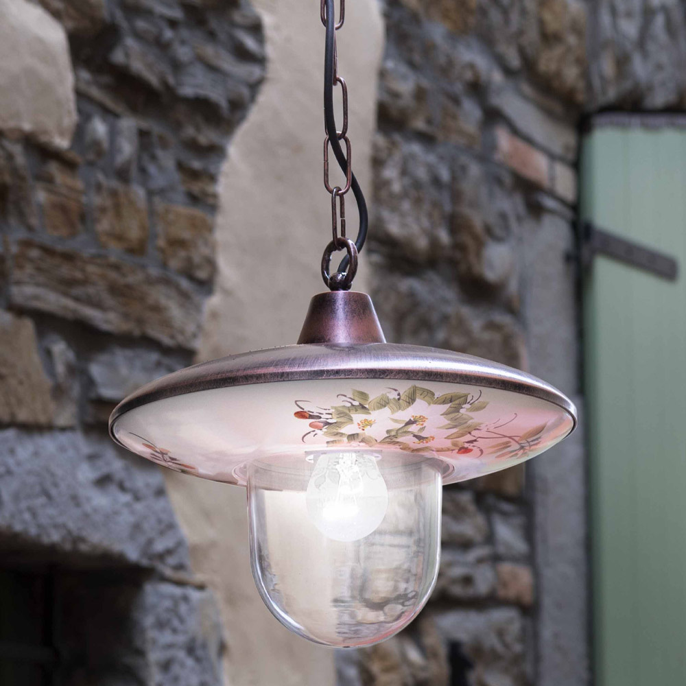 Esta lámpara colgante para el espacio exterior está hecha completamente de aluminio negro con pantalla de cobre y decorada con flores pintadas a mano para un estilo clásico y armonioso entre formas y colores.