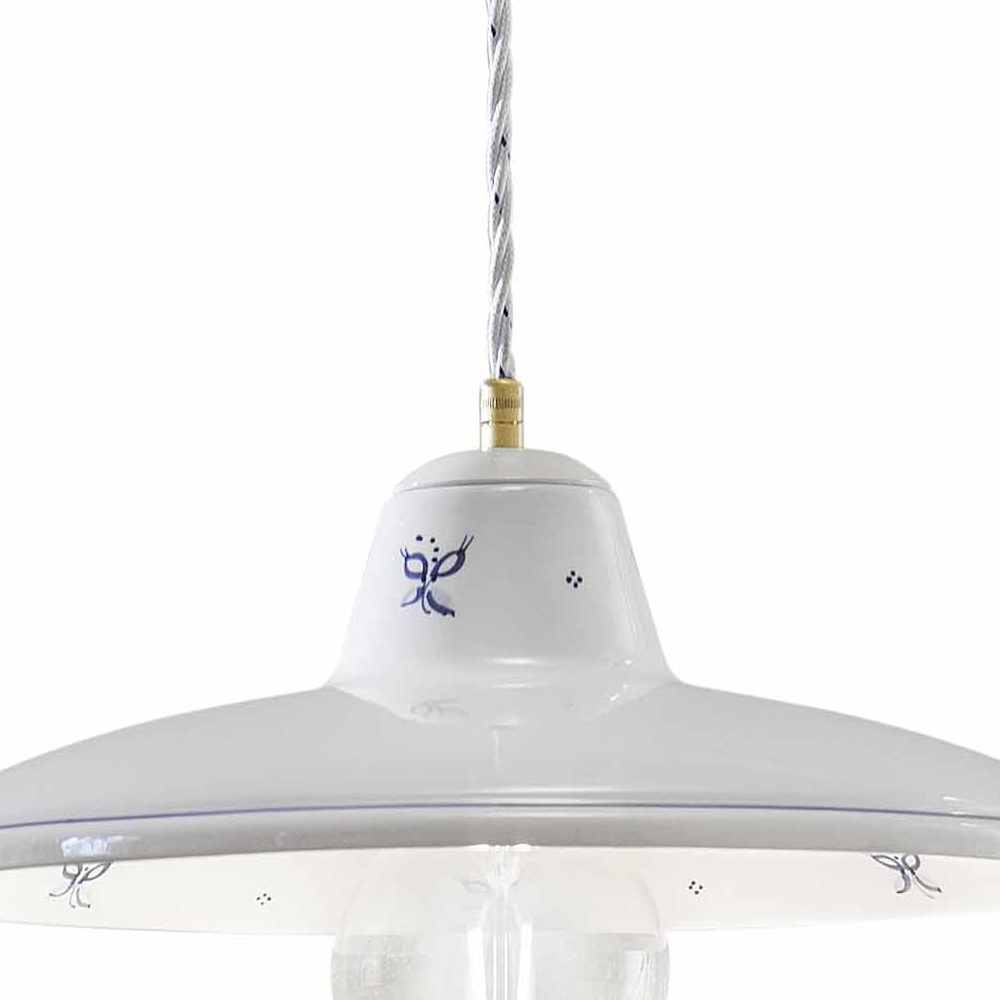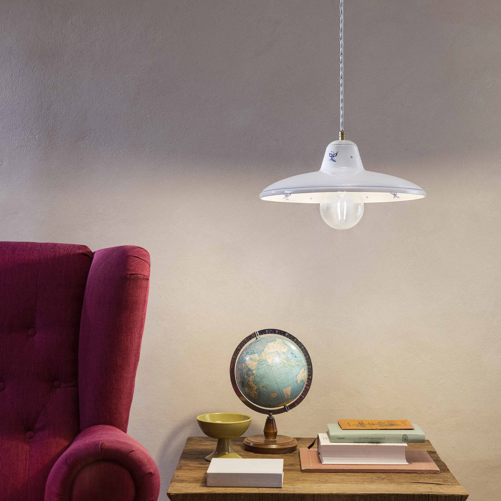 La lámpara suspendida está realizada íntegramente en hierro y cerámica blanca con delicados adornos pintados a mano que resaltan el trabajo artesanal y la destreza de los artesanos.