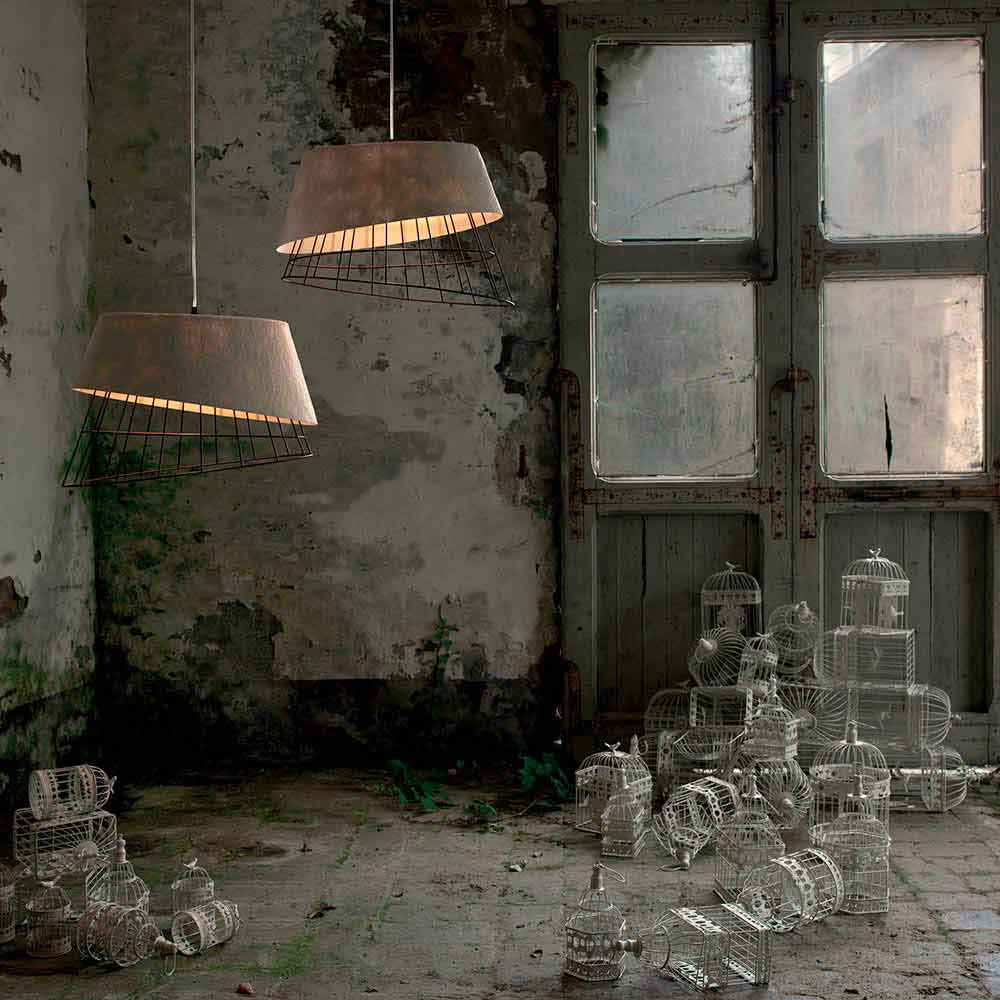 La lámpara está fabricada en fibra de vidrio blanca , un material capaz de sorprender por su bagaje cultural y técnico, con un difusor de malla metálica oxidada.