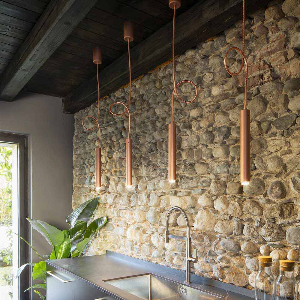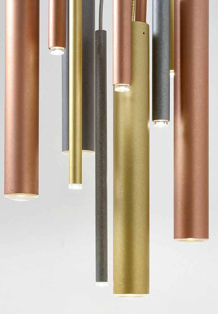 Tubò es una refinada lámpara de suspensión tubular con cable flexible, disponible en diferentes materiales y acabados:- aluminio martillado;