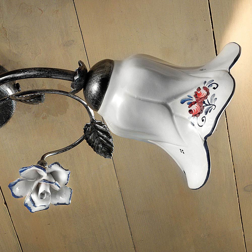 Plafón de 2 luces en metal y cerámica con rosas pintadas a mano fabricada en Italia por Ferroluce.