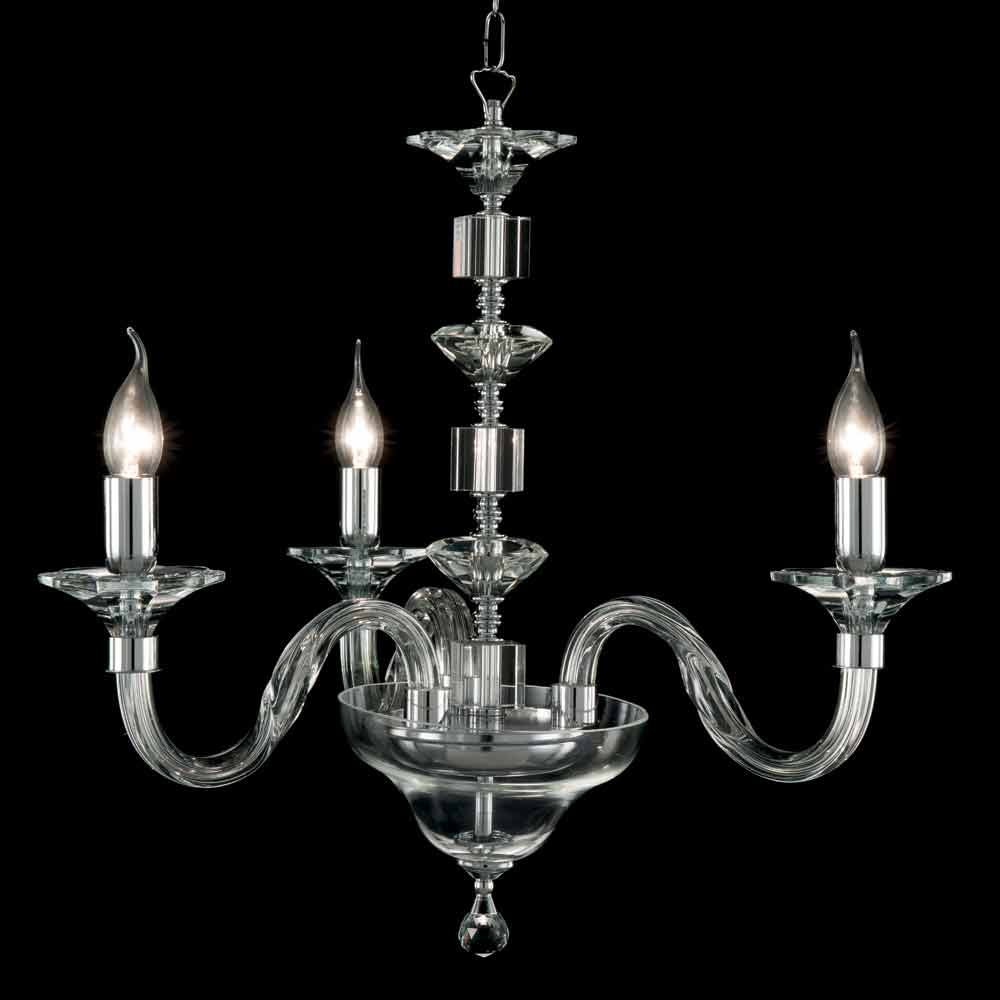 Araña de cristal transparente hecha a mano con adornos de cristal. Acabados cromados.