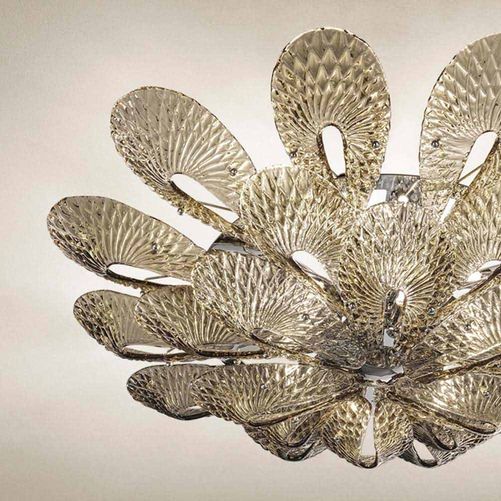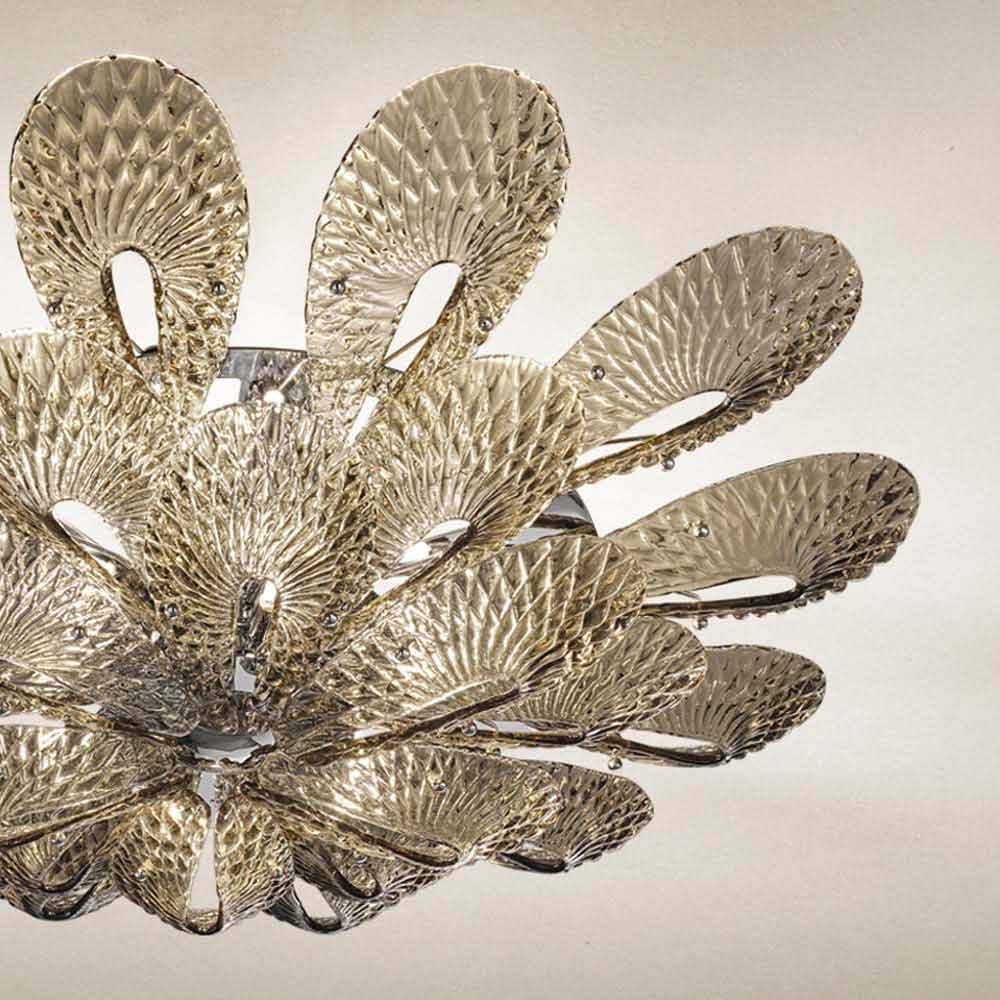 Majestuosa y elegante lámpara de techo hecha en Italia en Venecia en vidrio coloreado trabajado a mano con acabado ahumado y detalles en metal cromado pulido . Un diseño perfilado por formas inéditas que cristalizan para dar vida a delicadas cintas de vidrio que, al unirse, convergen en un fulcro luminoso. Su estética destaca gracias a su refinamiento de estilo que se adapta perfectamente a ambientes con mobiliario contemporáneo y da carácter a espacios con un gusto más clásico, demostrando ser eclécticos y versátiles . Para enriquecer su valor está el particular patrón de rombos que cubre toda la superficie, creando exclusivos juegos de luces .