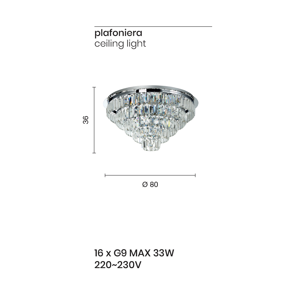 Se compone de una estructura de metal plateado y colgantes de cristal que decoran, iluminando cualquier ambiente con gusto y carácter, en una mezcla de estilo, clase e innovación.