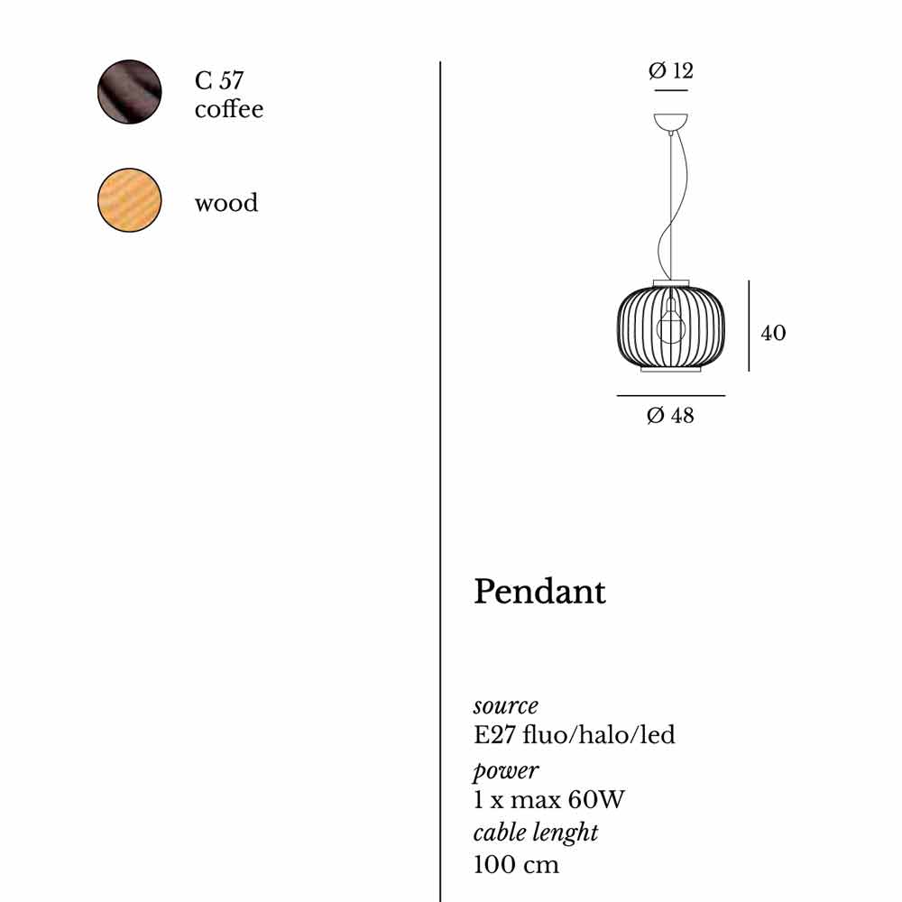 Lámpara de suspensión hecha de barra de acero con forma y pintada con polvos epoxi. Las dos bandas que cierran el cuerpo redondeado están hechas de madera natural.