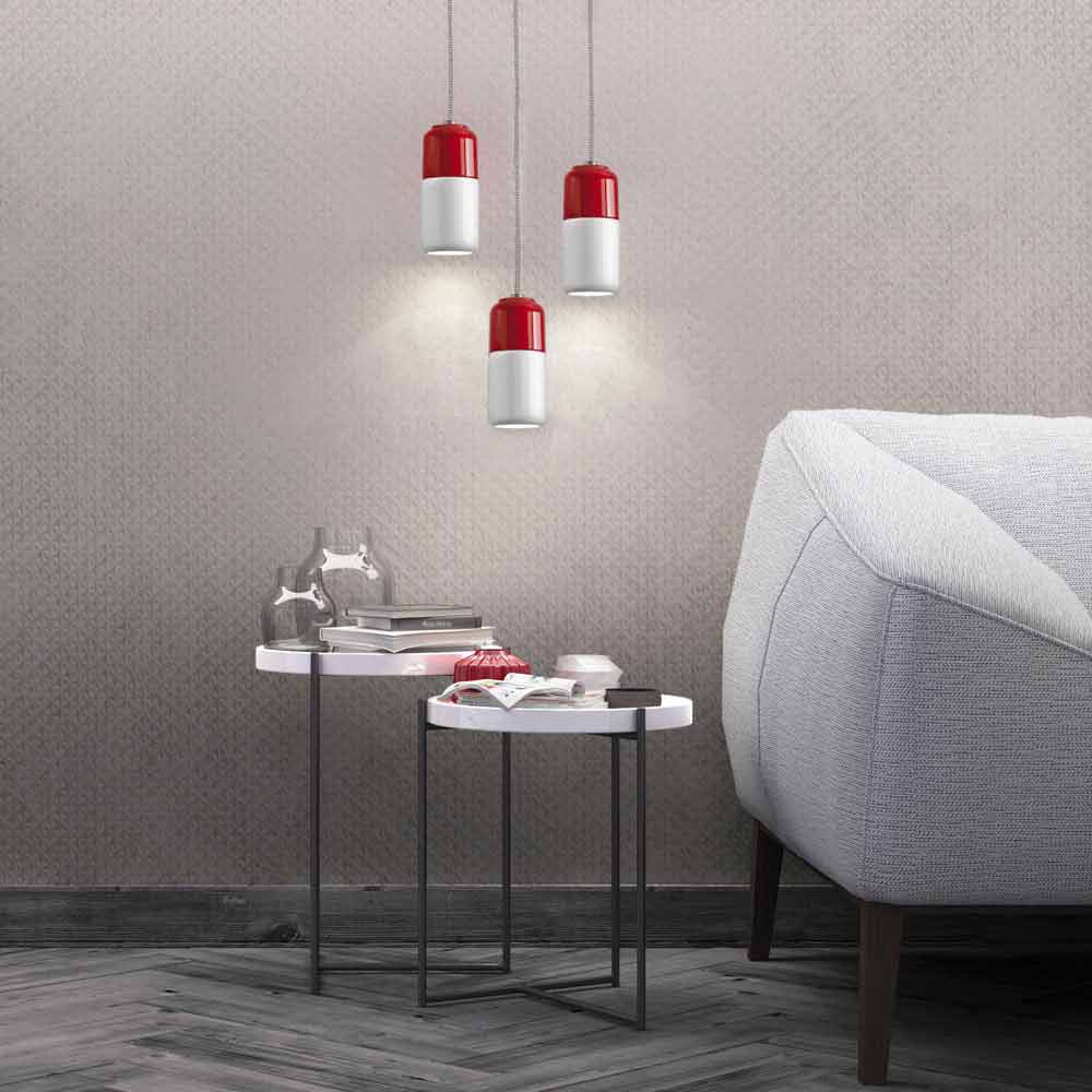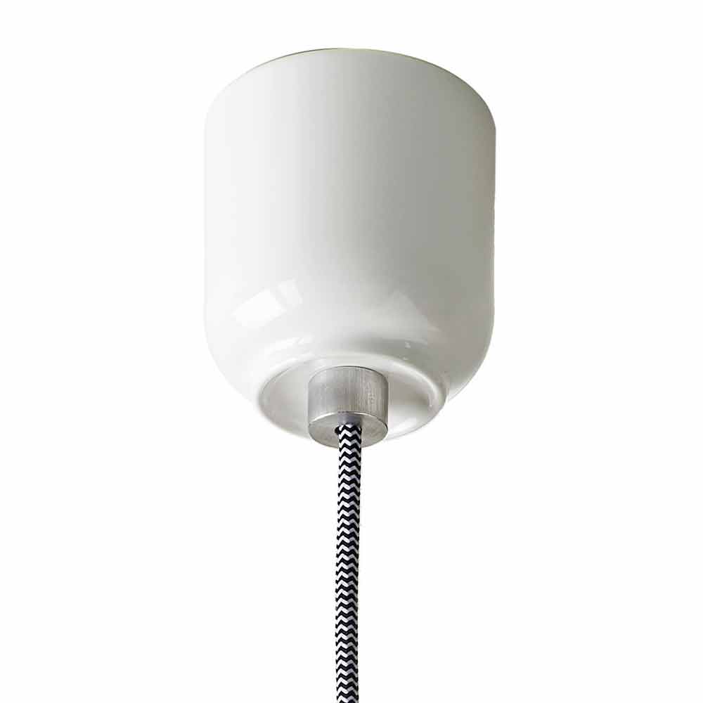 Hecho de cerámica roja y blanca con cable de tela blanco y negro y abrazadera de cable de aluminio.