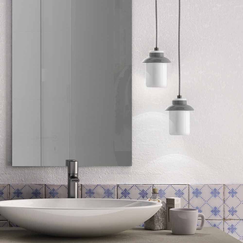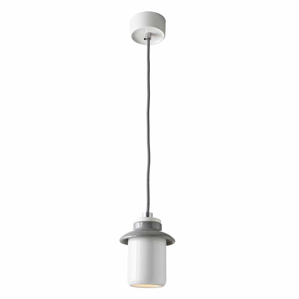 Asia es una lámpara de suspensión fantástica hecha de cerámica blanca y gris, con cable de tela blanco y negro y la abrazadera de cable de aluminio.