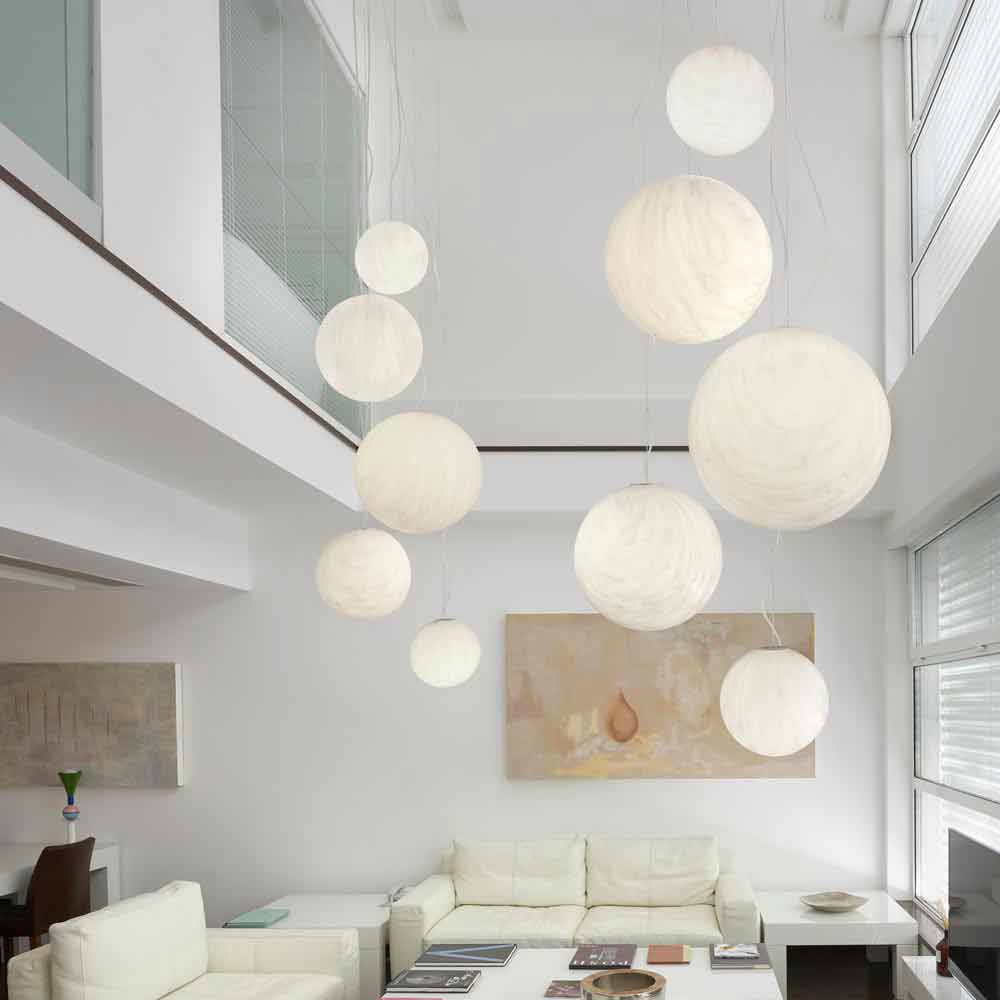 Se puede utilizar tanto como araña individual como como composición de esferas de diferentes tamaños para transformarla en un gran fulcro luminoso modular con rosetón para cinco lámparas Mineral, que se pueden vender por separado.