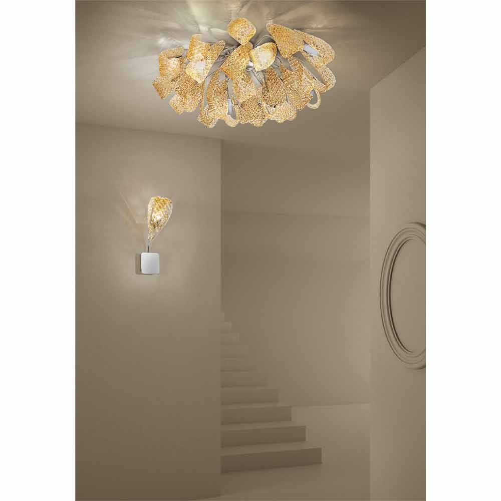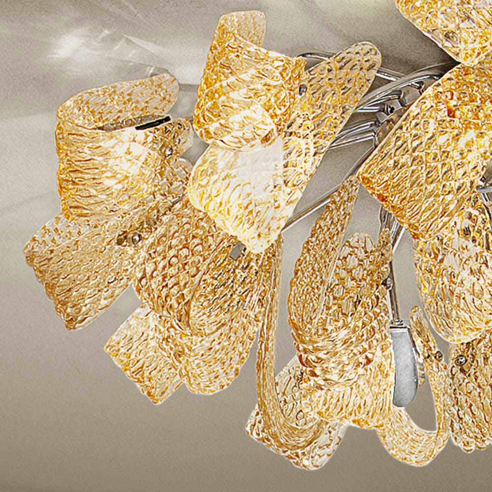 Lámpara de techo elegante y majestuosa fabricada en Italia en vidrio veneciano acabado ámbar elaborado a mano con detalles en metal cromado pulido . Una idea de iluminación compuesta por voluptuosas cintas y texturas inusuales que le dan su originalidad estética y una sensación de dinamismo . Lo que llama la atención es la textura geométrica que recubre la superficie del vidrio sobre la que se refleja la luz en los detalles metálicos para maravillosos juegos de reflejos . El resultado es un maravilloso plafón capaz de adaptarse a cualquier ambiente contemporáneo y dar carácter a espacios más clásicos, demostrando ser especialmente versátil.