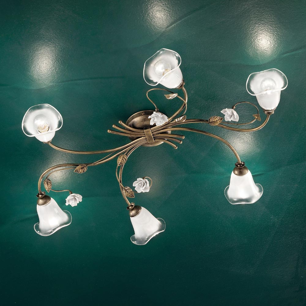 Esta lámpara de techo de 6 luces está realizada íntegramente con una estructura de metal que recuerda a las ramas frondosas y tulipas de cristal arenado a la sombra con decoraciones artesanales en forma de rosas de cerámica , para resaltar la artesanía y las habilidades manuales de los artesanos.