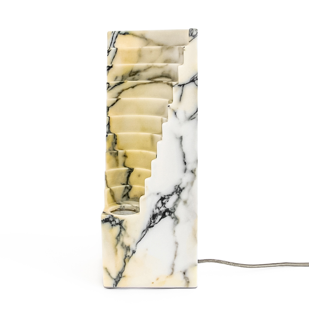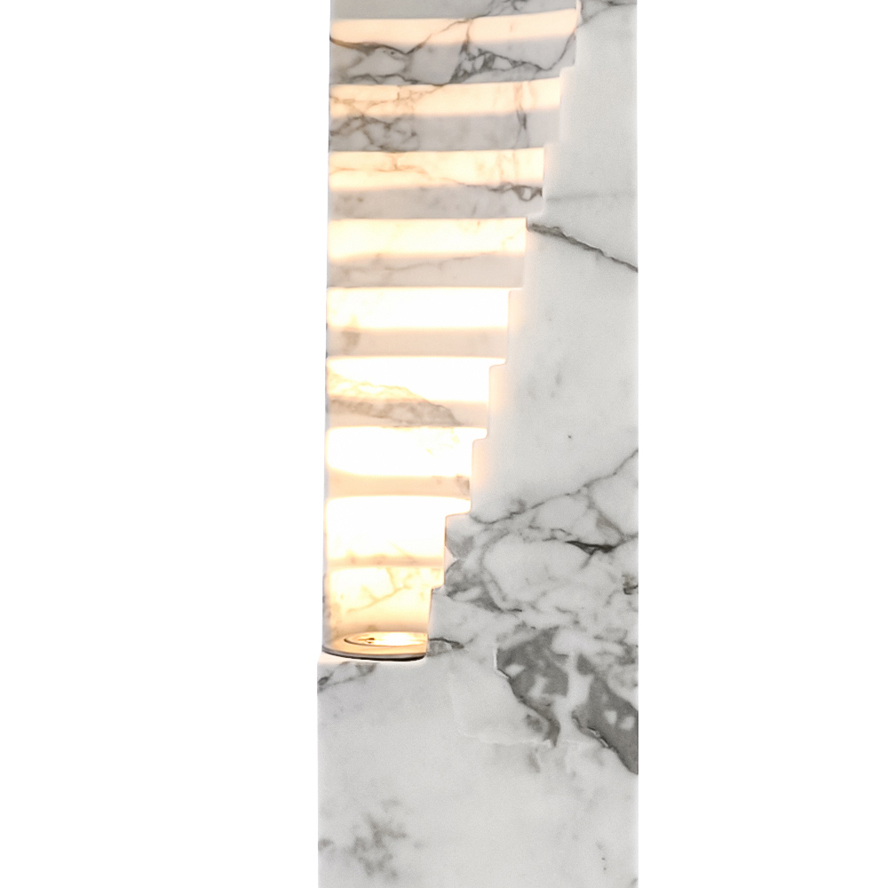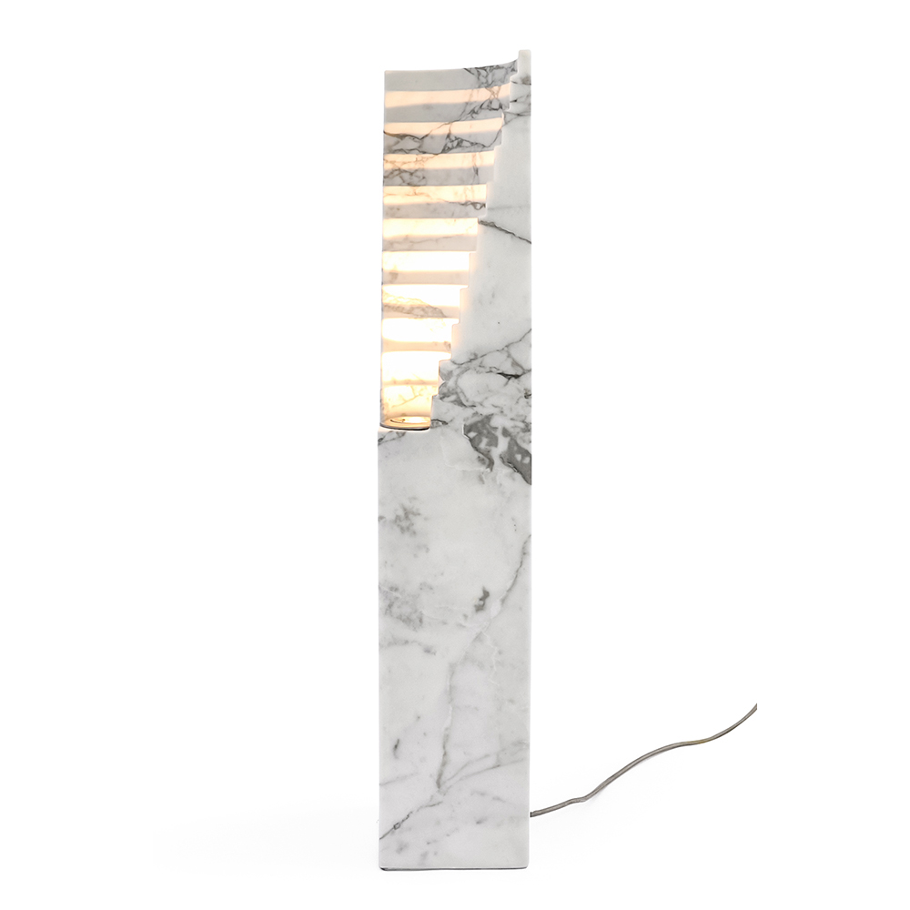 Déjate encantar por esta lámpara de mármol , una auténtica joya del diseño contemporáneo . La estructura vertical, majestuosa y esbelta, está hábilmente tallada para dejar filtrar la luz a través de sus líneas geométricas . Cada segmento de mármol, con sus vetas únicas, se convierte en un lienzo vivo que captura y difunde la luz en un juego de claroscuros que enriquece cualquier ambiente.