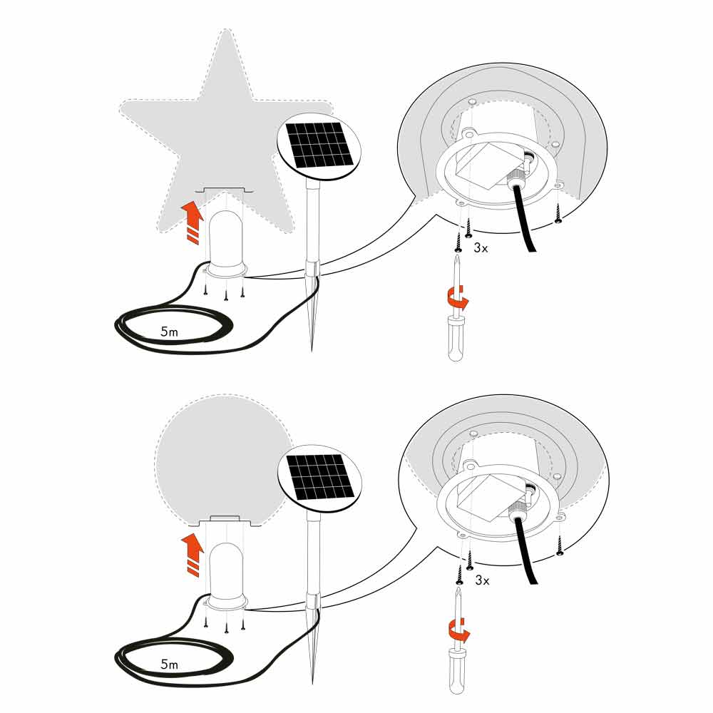 - Accesorio solar para exterior : incluye un sistema de iluminación LED blanco monocromático de instalación permanente con un módulo solar externo con batería integrada (1800mA) que captura la luz solar durante el día y luego la convierte en electricidad. Se requiere una cantidad suficiente y adecuada de iluminación solar para la correcta carga de la lámpara, que se enciende de forma independiente al anochecer mediante un sensor de luz. Este sistema no requiere enchufes eléctricos, salvaguardando el medio ambiente. Ideal para iluminar caminos, balcones y patios. Duración con carga completa: unas 6 horas. Consumo de energía: 2 vatios, temperatura: blanco cálido 3000K, cable negro de 5 m.