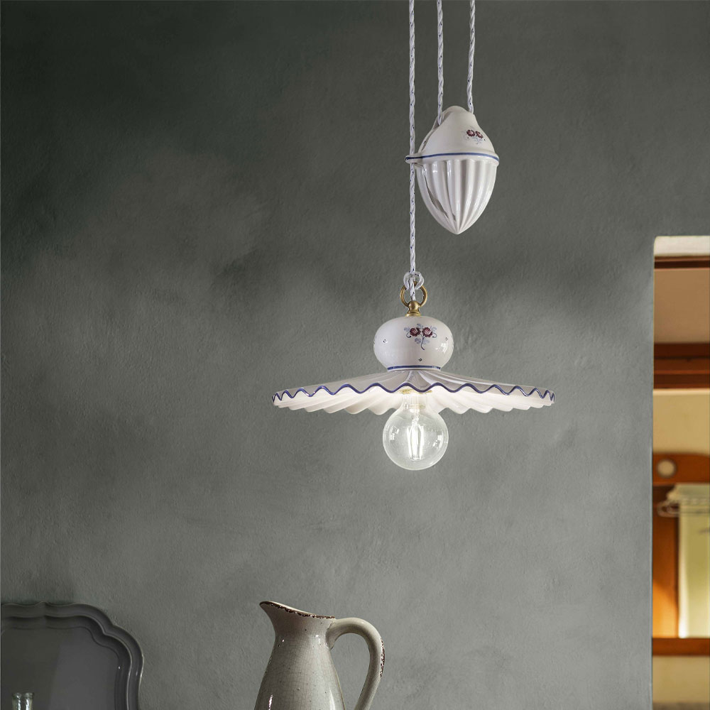 Lámpara corredera suspendida artesanal en metal y cerámica pintada a mano fabricada en Italia por Ferroluce.