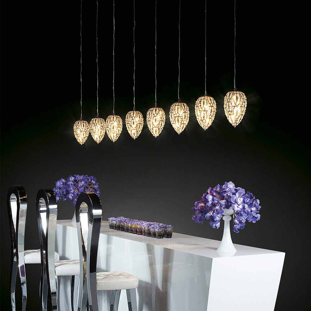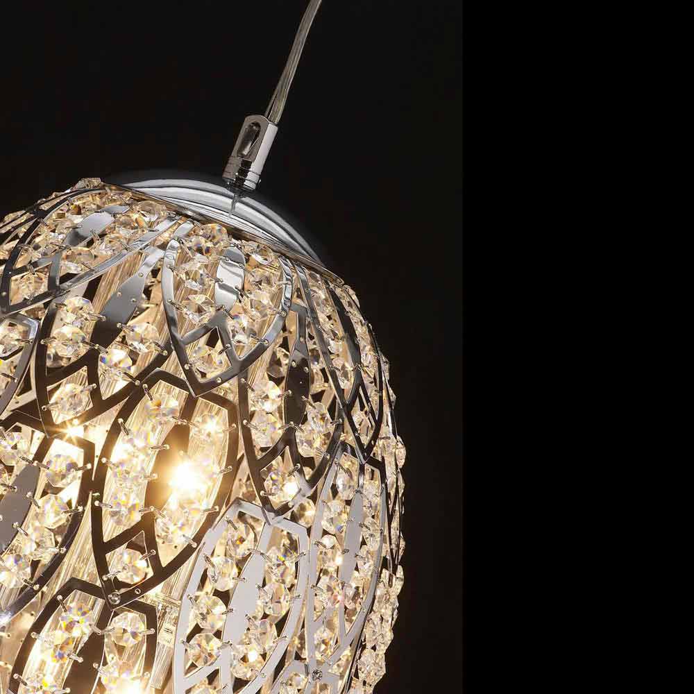 La peculiaridad esencial de la lámpara reside en la presencia de cristales Asfour tallados y fijados manualmente en la estructura misma, lo que pone de relieve la unicidad del producto.