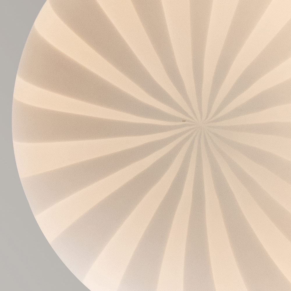 La lámpara está realizada con un difusor de vidrio de filigrana blanca de forma artesanal , un material que otorga brillo y modernidad a la luz, que la atraviesa creando atmósferas sublimes y atractivas, y una base de aluminio extraíble.
