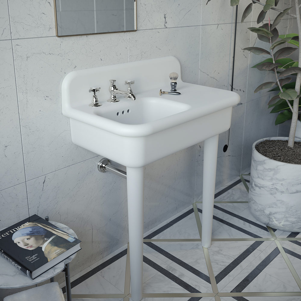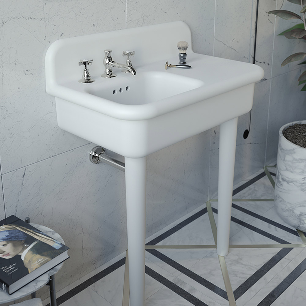 2 patas de cerámica blanca sobre las que se apoya el lavabo.