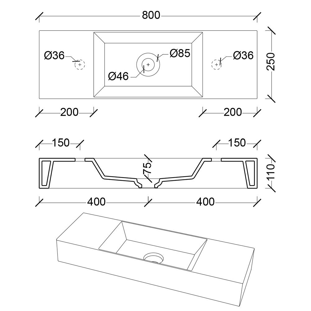 NB : este artículo se puede utilizar tanto en apoyo como suspendido. Preparado para grifería derecha, izquierda o mural (a especificar en el pedido).