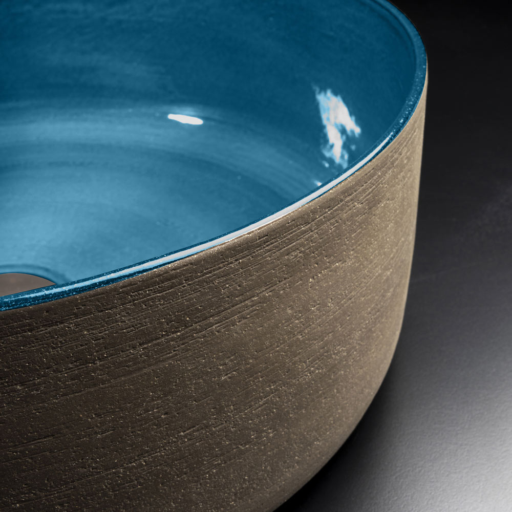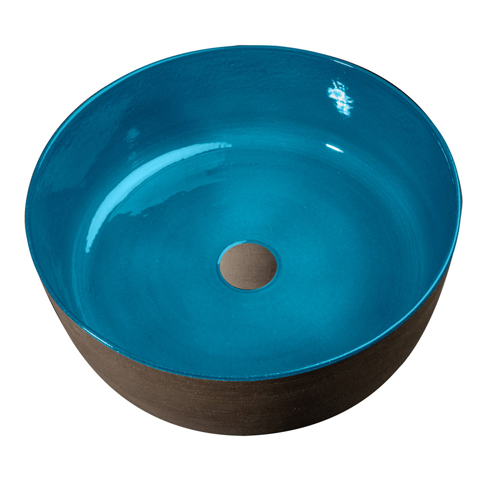 Lavabo redondo sobre encimera realizado íntegramente en Italia en arcilla refractaria , torneado a mano con cocción al tercer fuego. Su estética se caracteriza por la perfecta combinación del exterior encerado natural e hidrofugado con un estilo más rústico y el interior acabado azul brillante y vitrificado con un gusto más elegante y refinado. Cada elemento del lavabo está elaborado a mano para dar vida a una solución de decoración exclusiva, de gran valor y calidad inigualable.