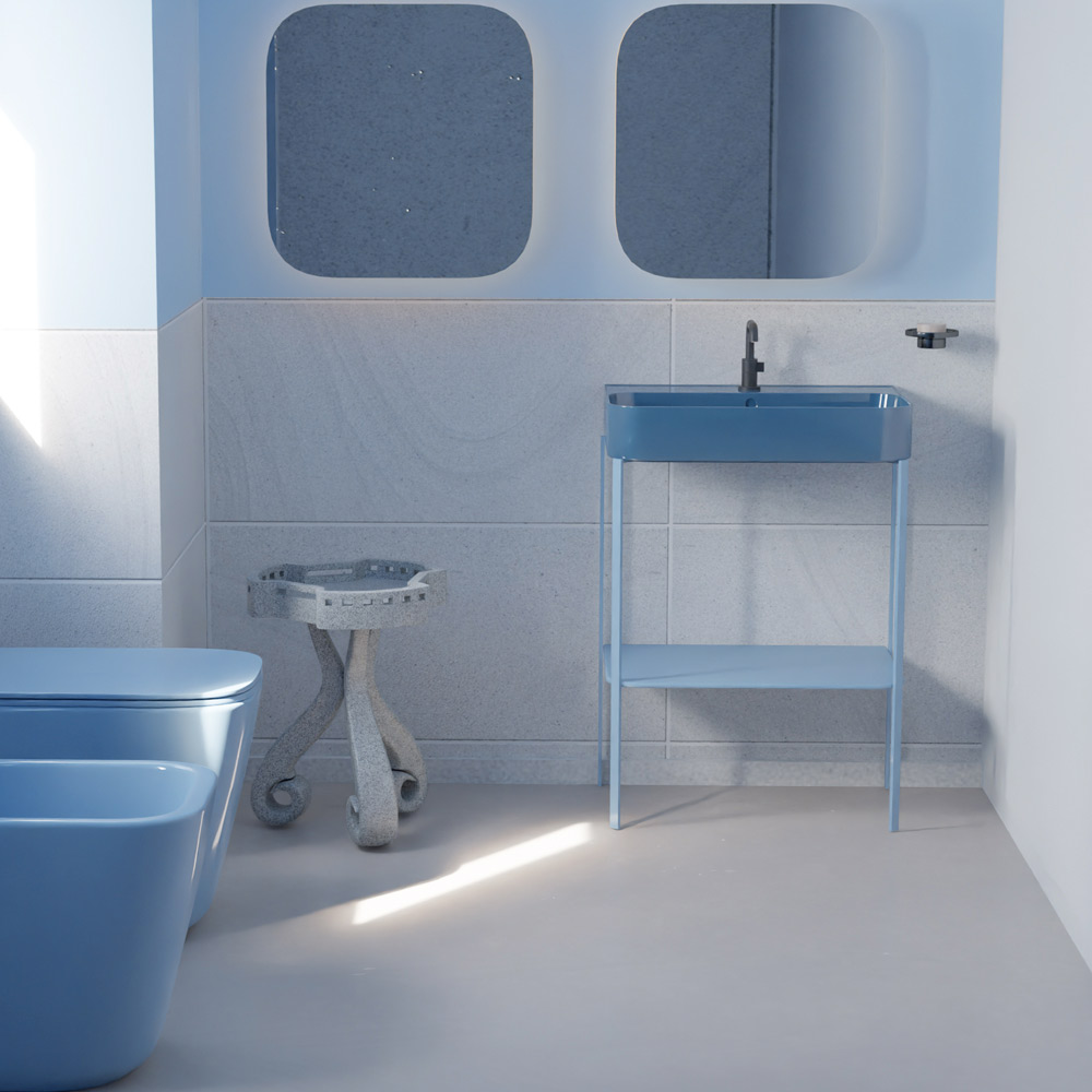 La estructura, con un estante inferior , no sólo sostiene elegantemente el fregadero sino que también proporciona una útil zona de almacenamiento, optimizando el espacio sin renunciar al estilo.