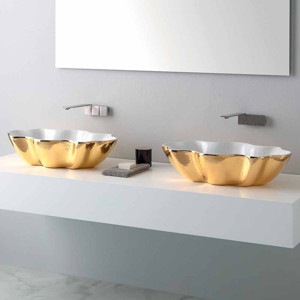 Cubo es un lavabo sobre encimera fabricado en Italia en cerámica de extralujo en dos colores dorado y blanco.