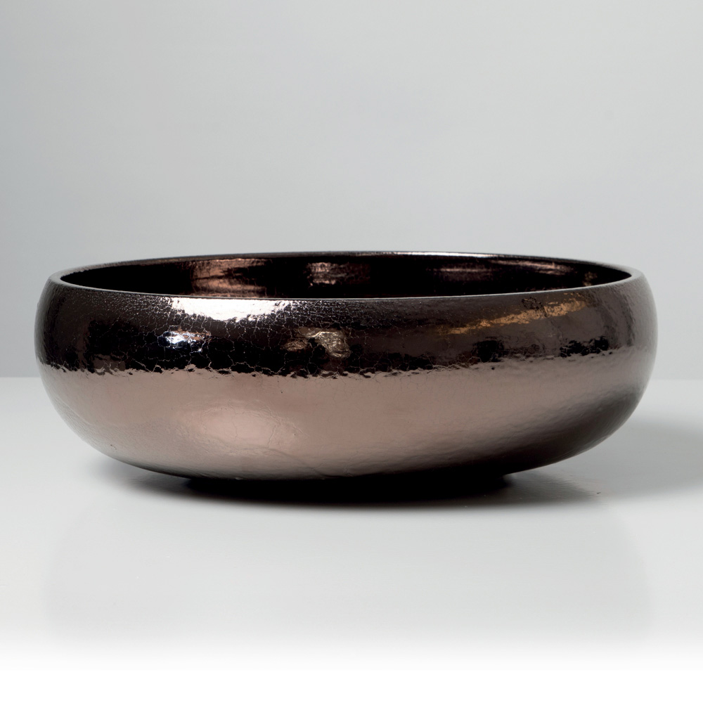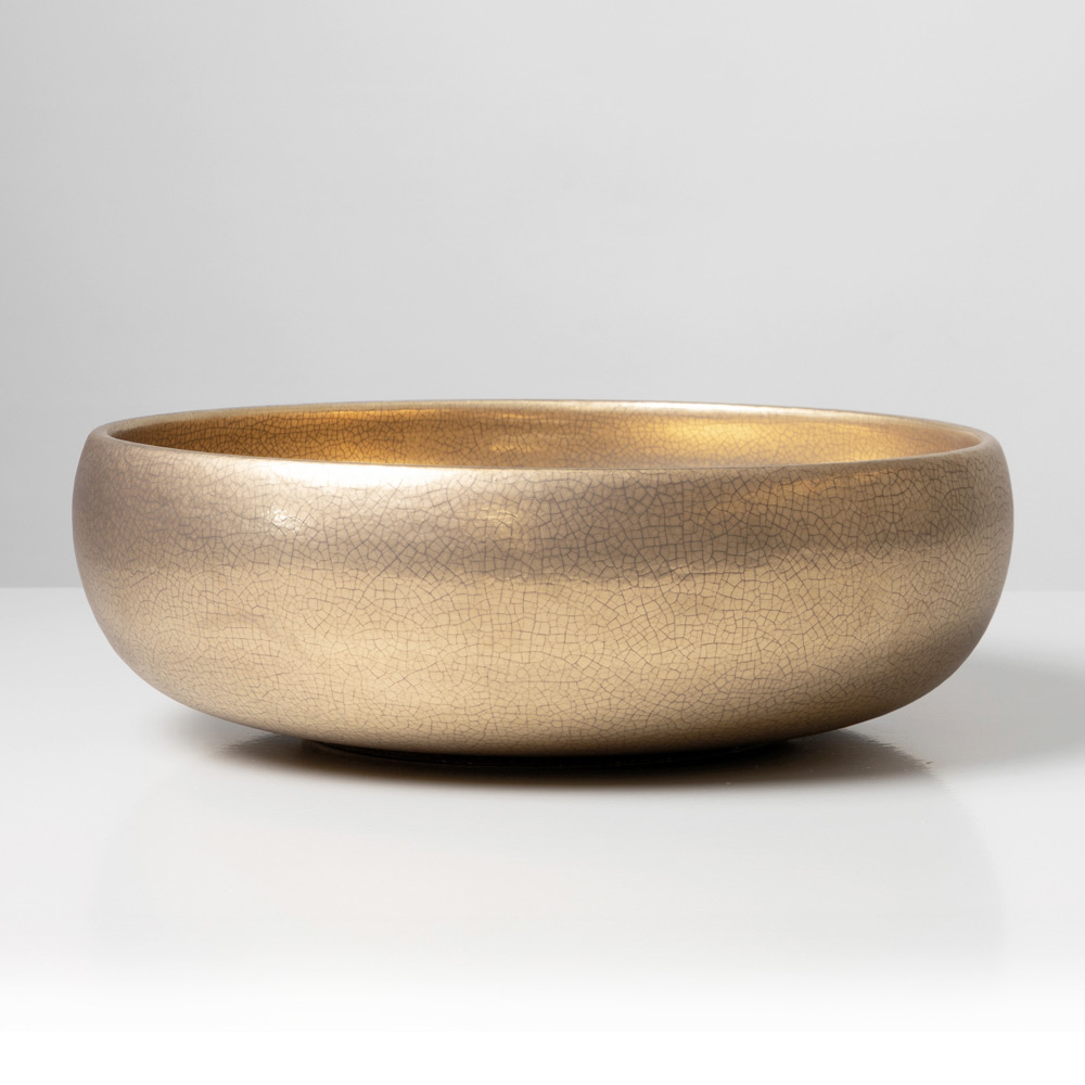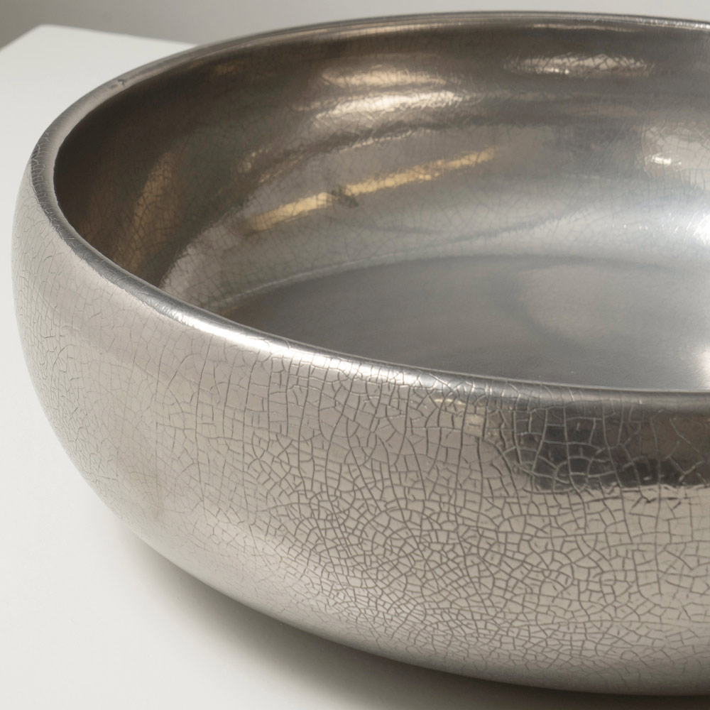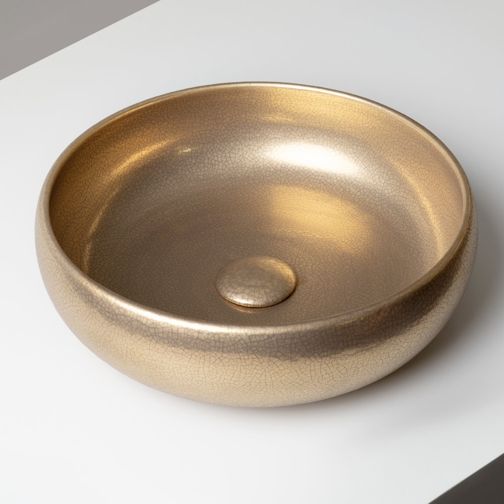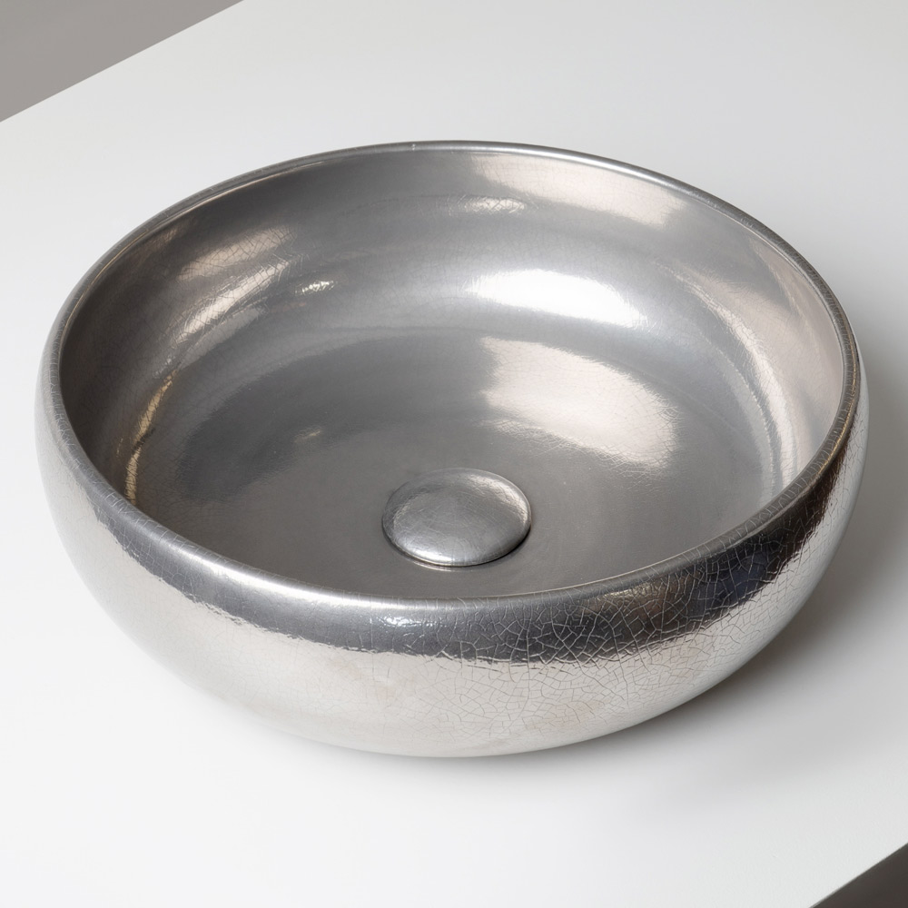 La superficie está embellecida con refinados acabados metálicos craquelados , aplicados tanto en el interior como en el exterior del lavabo. Las microfracturas del esmalte crean profundos reflejos iridiscentes, que confieren al producto un aspecto lujoso y altamente decorativo. Cada lavabo es único gracias a las variaciones naturales creadas por la artesanía.