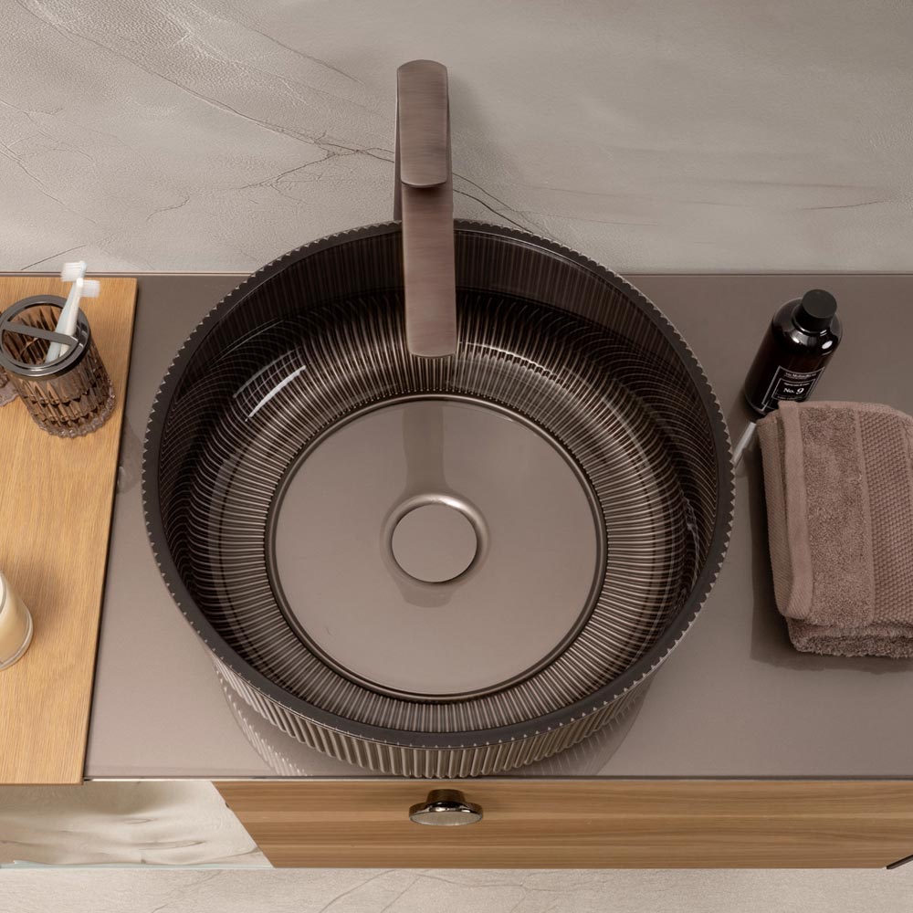 Disponible en sofisticados colores , el lavabo se adapta tanto a ambientes clásicos como contemporáneos, aportando siempre un carácter exclusivo y refinado. Los tonos, combinados con el brillo natural del vidrio, aportan profundidad y movimiento, transformando el lavabo en una auténtica obra de arte decorativa.