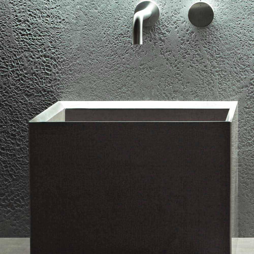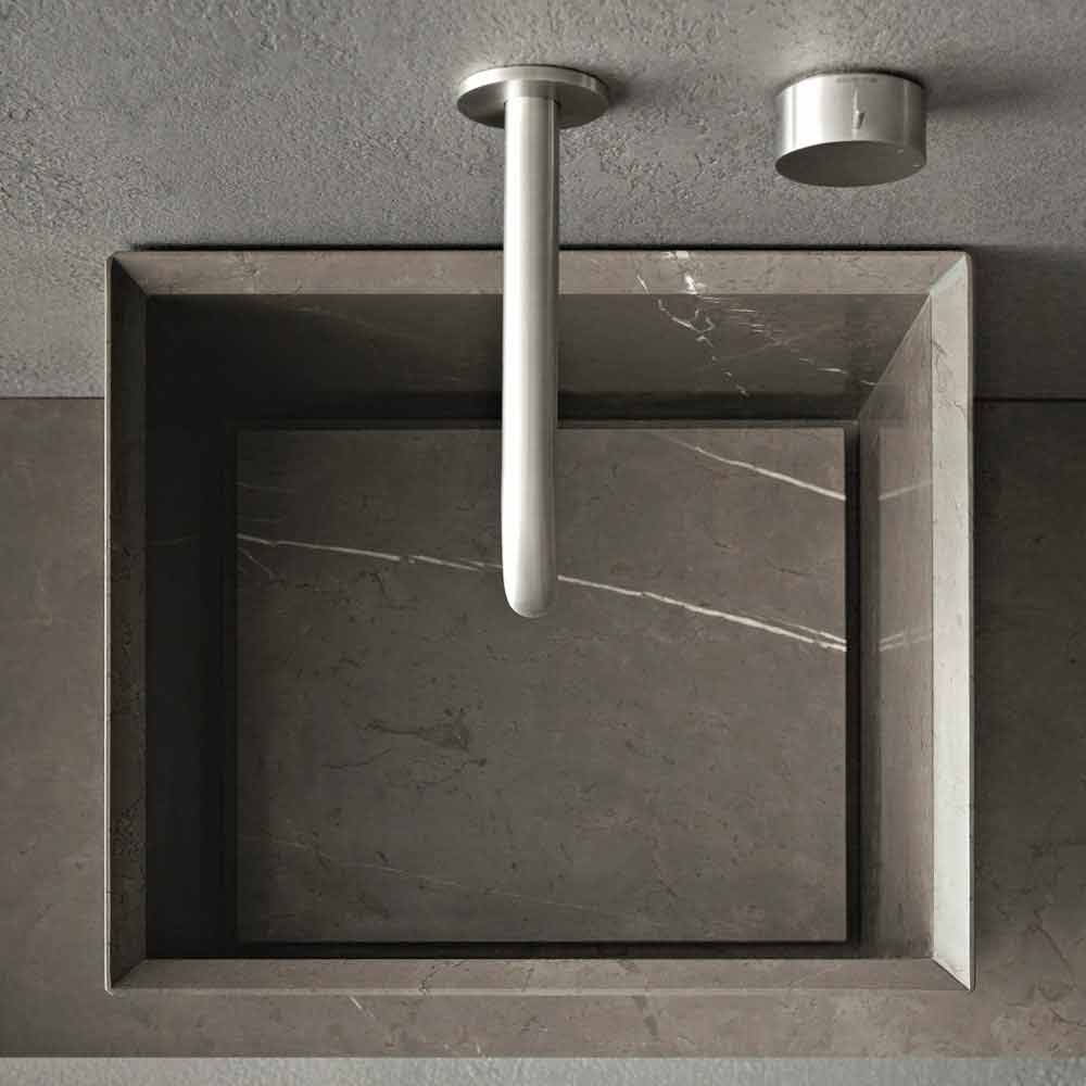 Lavabo sobre encimera cuadrado, de diseño moderno en piedra natural, con desagüe oculto.
