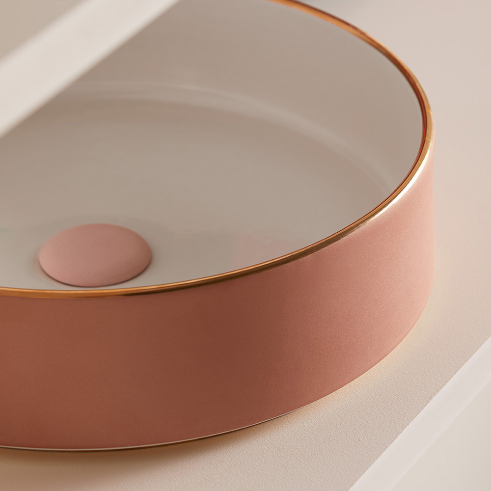 toque alegre e innovador. Acabados disponibles:- Interior blanco brillante, superficie lisa, exterior en polvo mate, superficie del material y borde dorado brillante.