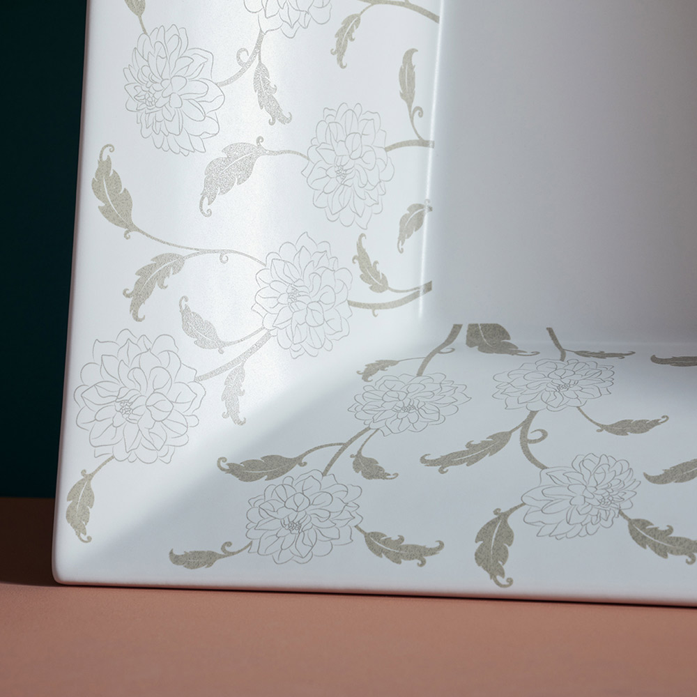 • decoración interior en relieve de flores sobre esmalte blanco mate, exterior esmalte blanco mate