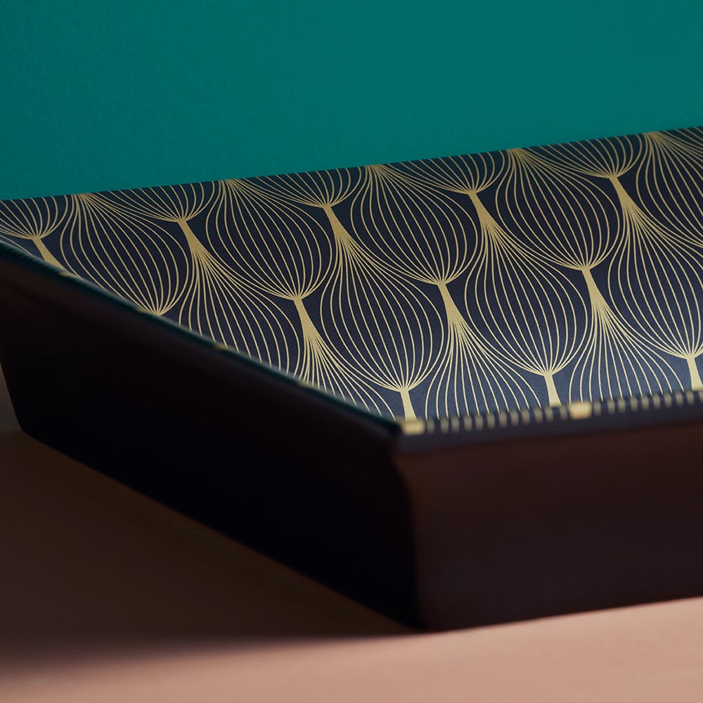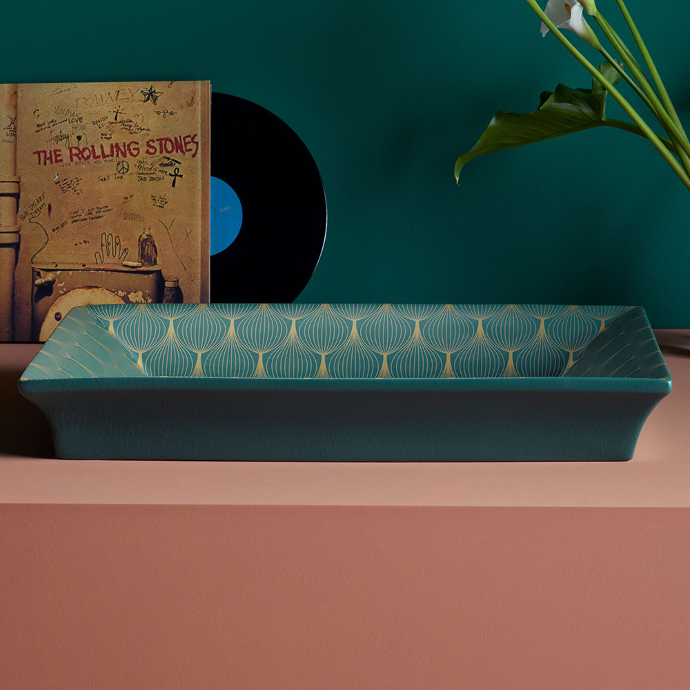 • textura interior en esmeralda mate y oro, exterior en esmalte esmeralda mate