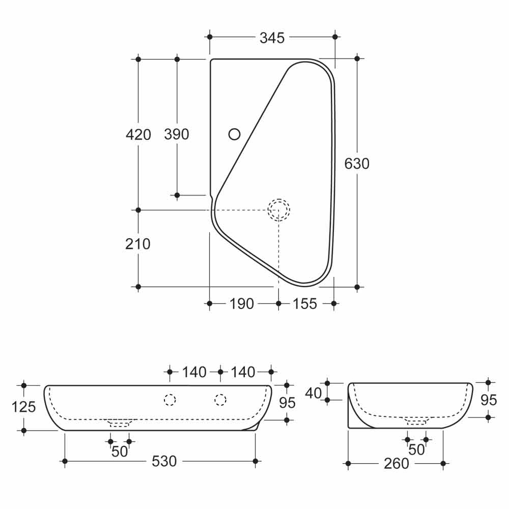 Lavabo de diseño con lavabo triangular, provisto de balda para albergar la grifería y el jabón.