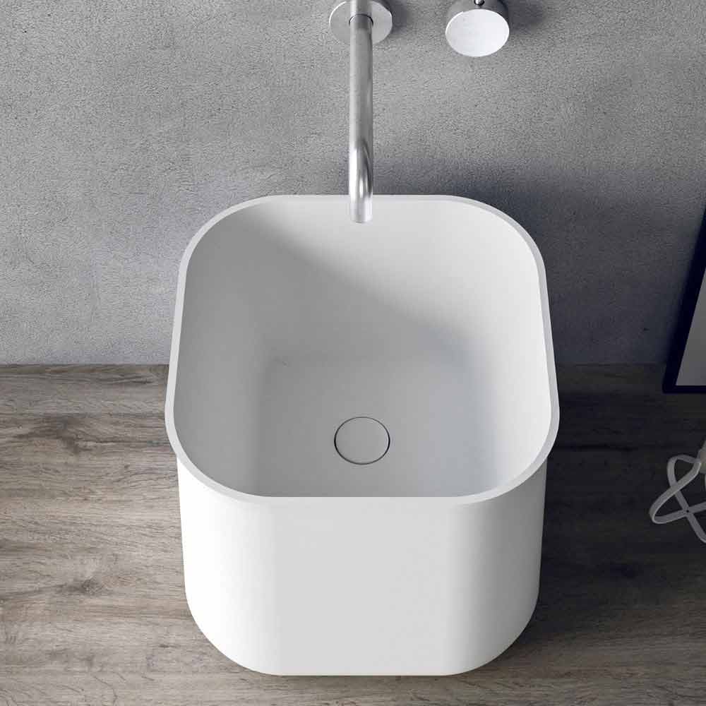 Lavabo sobre encimera cuadrado en resina blanca, diseño moderno con cantos altos.