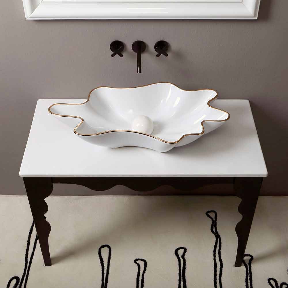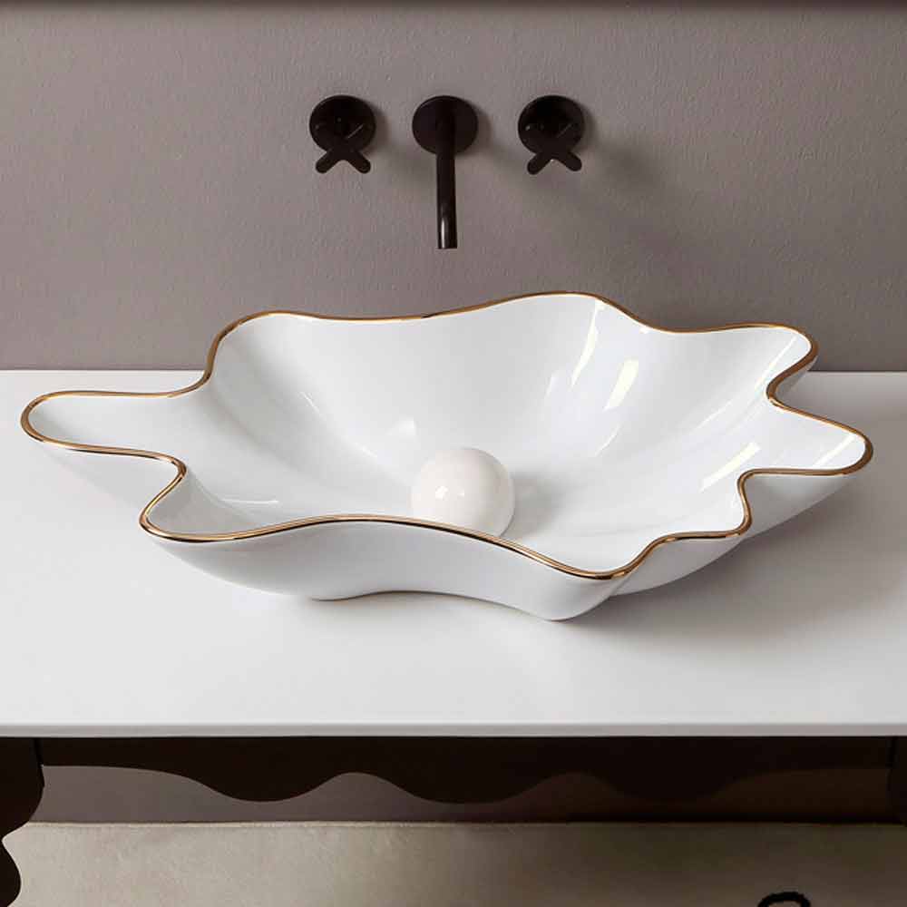 Lavabo sobre encimera de cerámica blanca con borde dorado fabricado en Italia Rayan