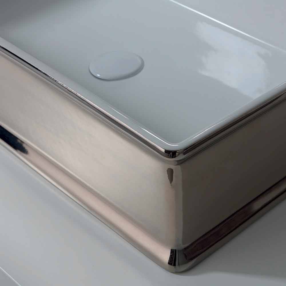 Debora es el lavabo sobre encimera realizado en cerámica con acabado blanco y platino que encarna el refinamiento y la elegancia sin descuidar la funcionalidad.
