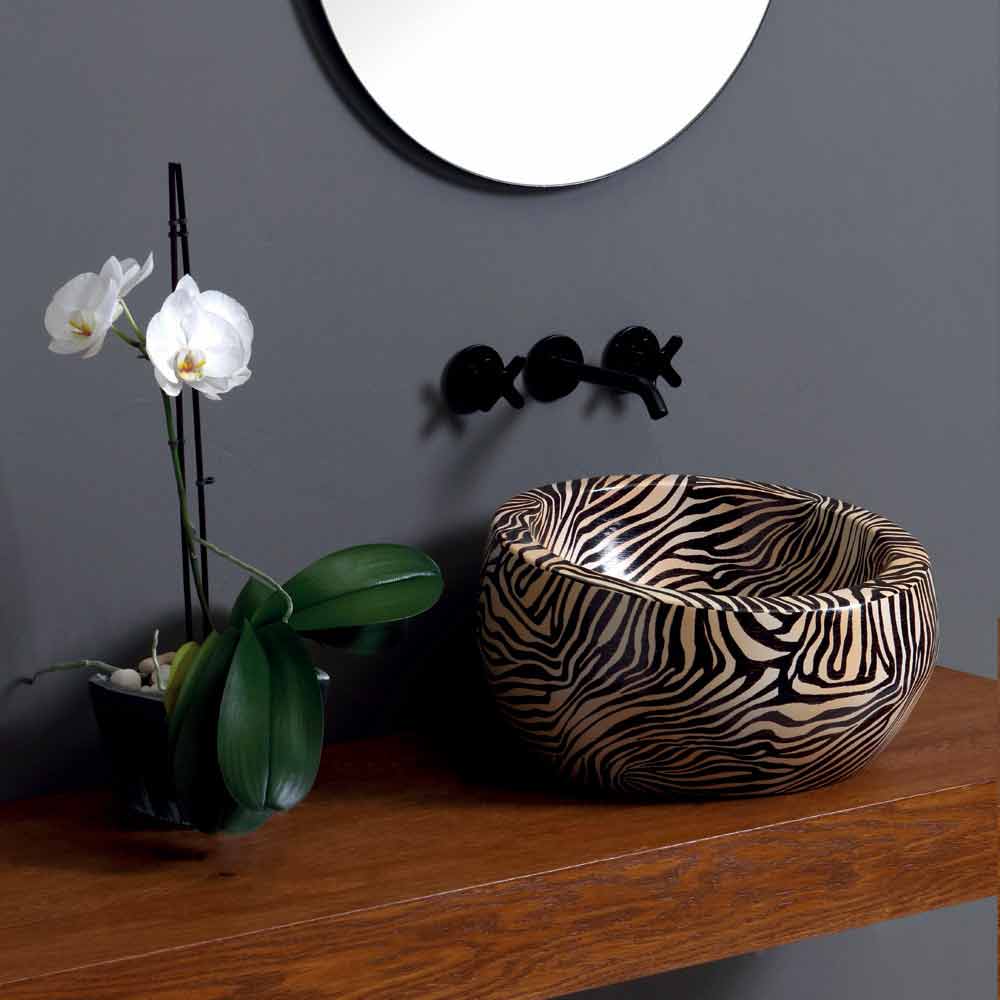 Elisa es un lavabo sobre encimera de cerámica con acabado cebra naranja de líneas ligeras y decididas.