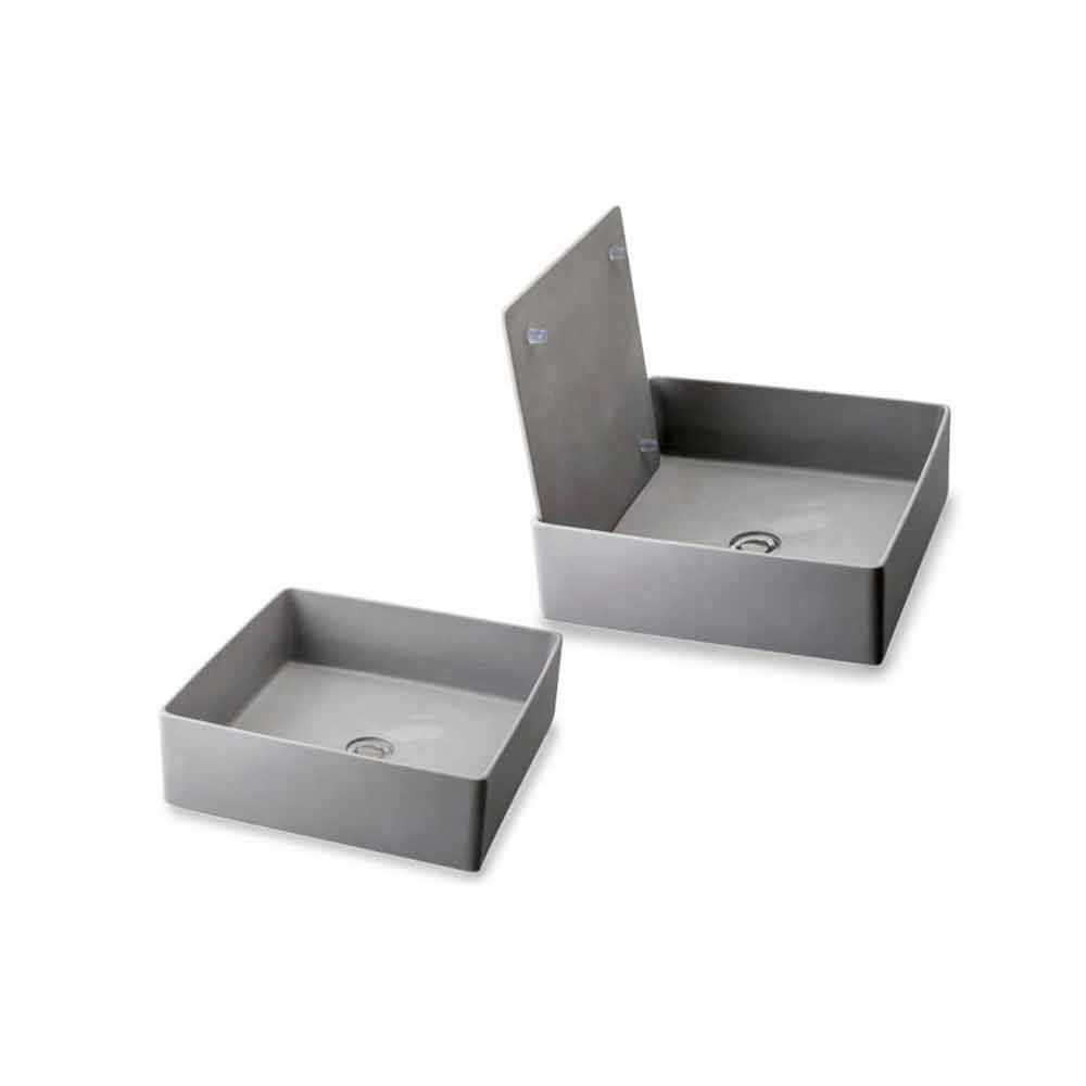 ¡Este fregadero sabe cómo cambiarse de ropa cuando sea necesario! Este fregadero sobre encimera en resina gris está equipado con una bandeja interna extraíble que, permitiendo que el agua se escurra por los bordes, cubre y oculta el desagüe central. Lavabo sobre encimera en resina gris con placa interna cubriendo el desagüe central. Placa disponible en: resina, madera y acero.