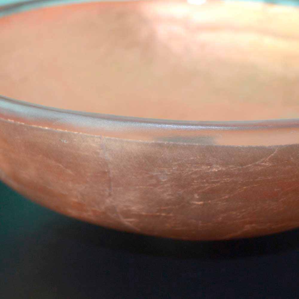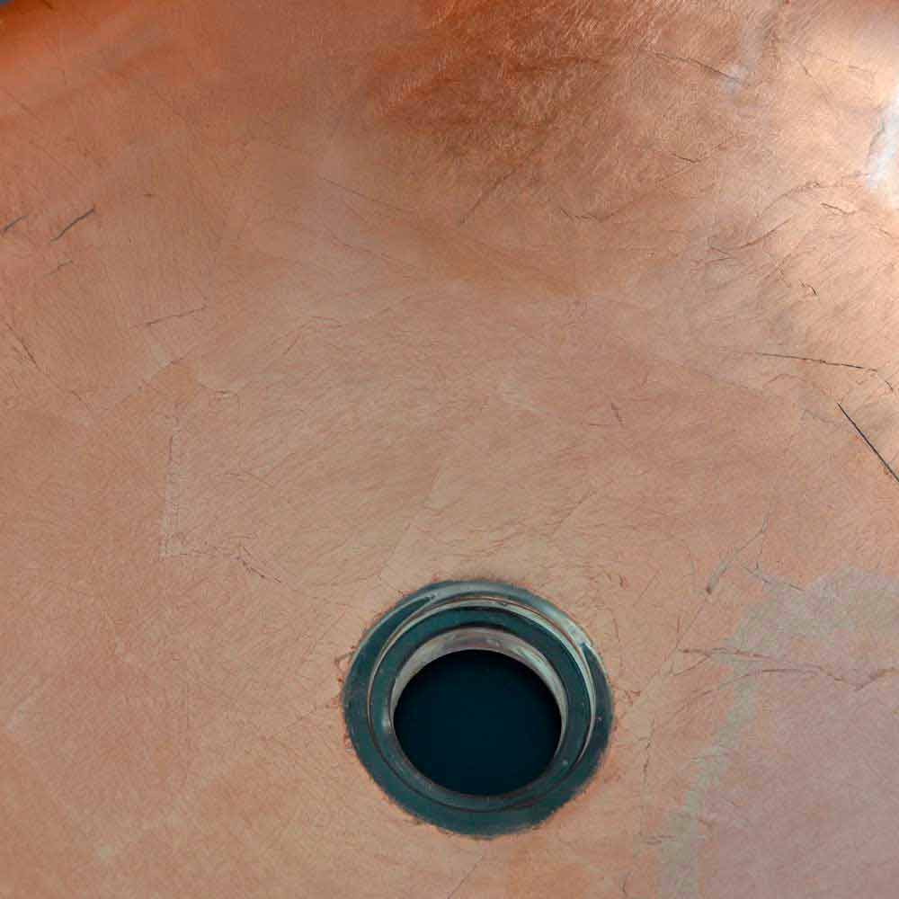 Lavabo fabricado en resina transparente y hoja de cobre.