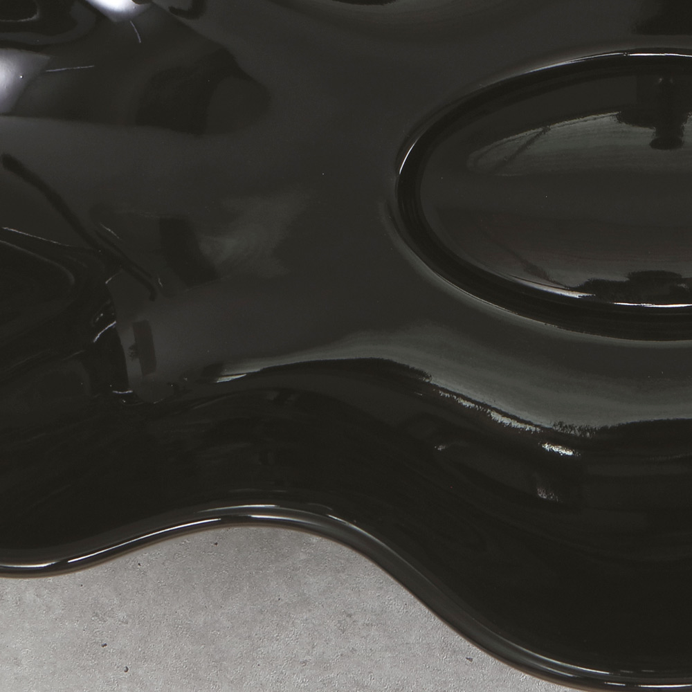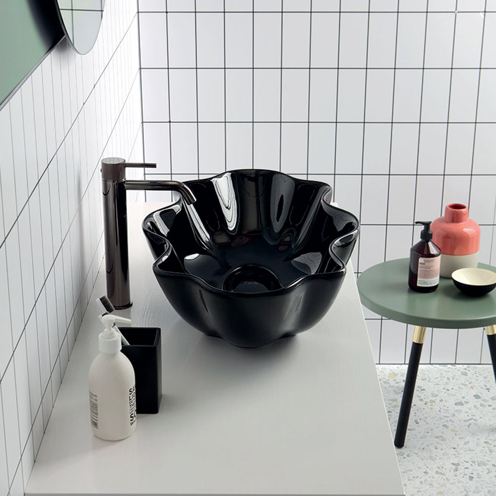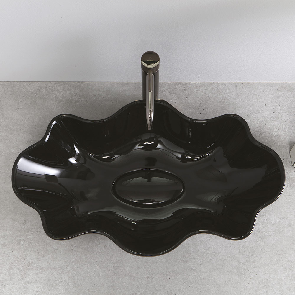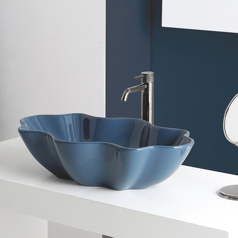 Lavabo de encimera con forma para la zona del baño en cerámica coloreada con acabado brillante fabricado en Italia a través de una producción artesanal . Un diseño original y cautivador que nace del deseo de proponer soluciones de decoración alejadas de los productos de la serie clásica. El resultado es un lavabo con una estética exclusiva que llama la atención gracias a su imponente personalidad moderna y la forma particular que recuerda a una concha.