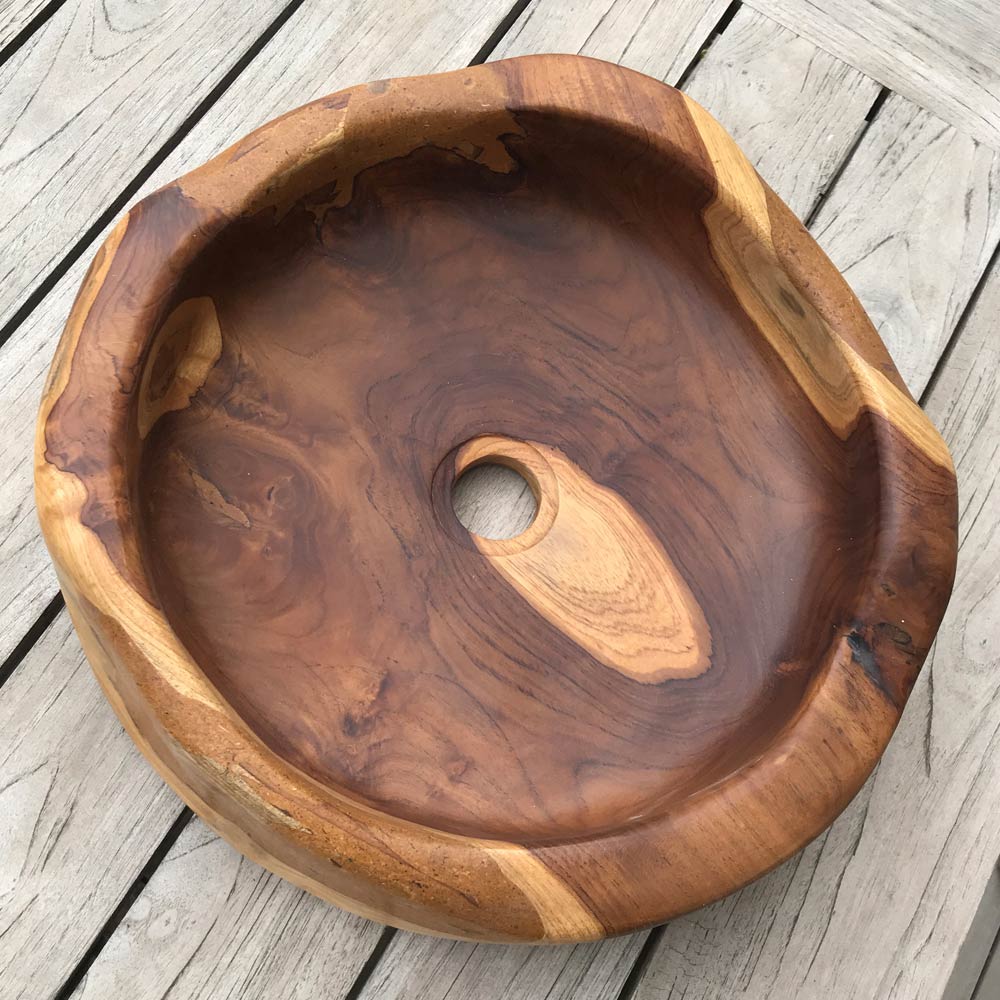 Teca natural y pulida en una forma esencial y práctica. La madera sin tratar devuelve los aromas y colores de los bosques tropicales. Lavabo sobre encimera en teca natural lisa y sin tratar.