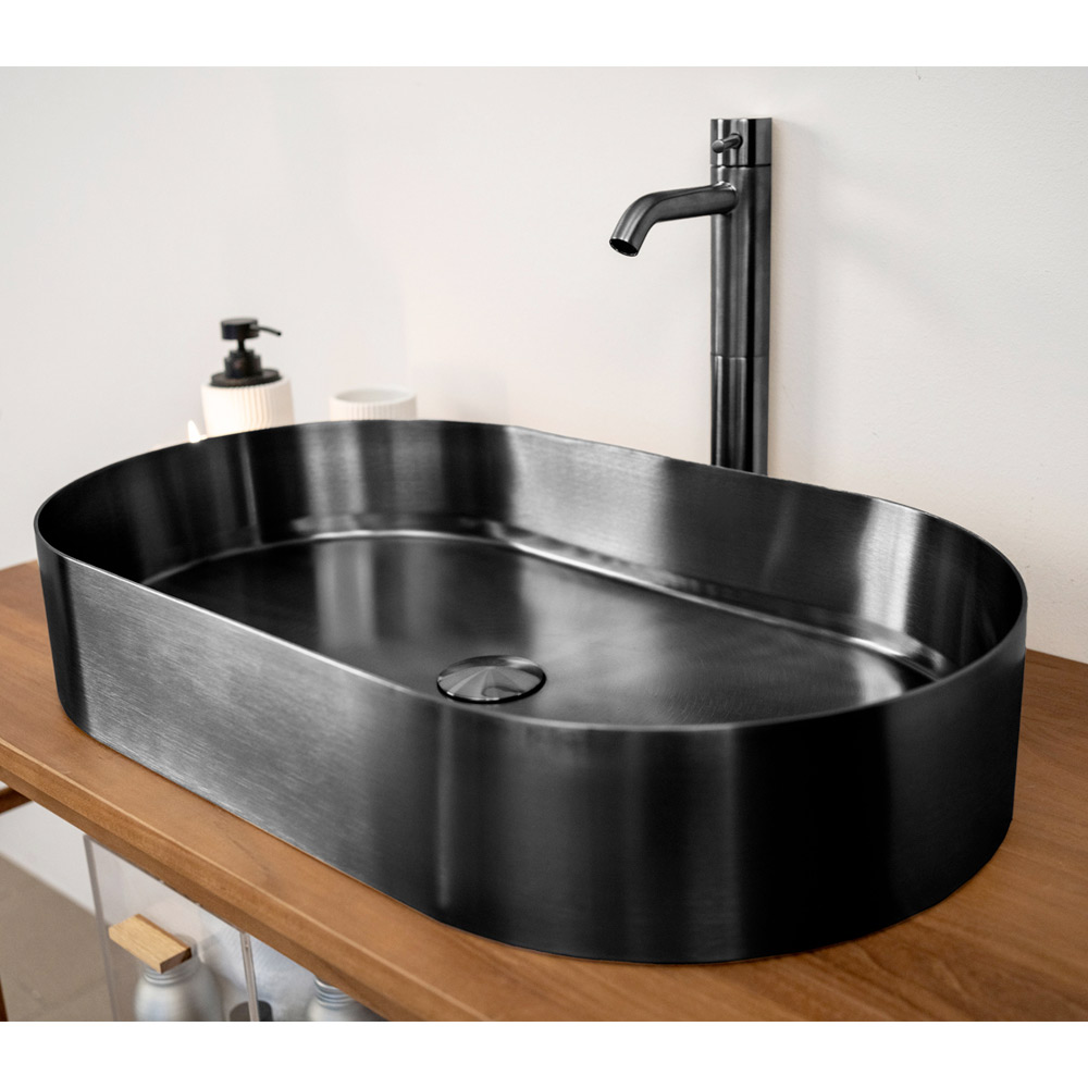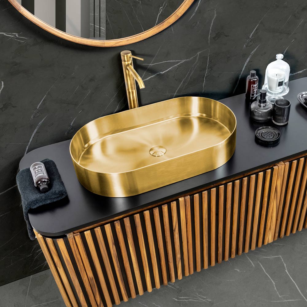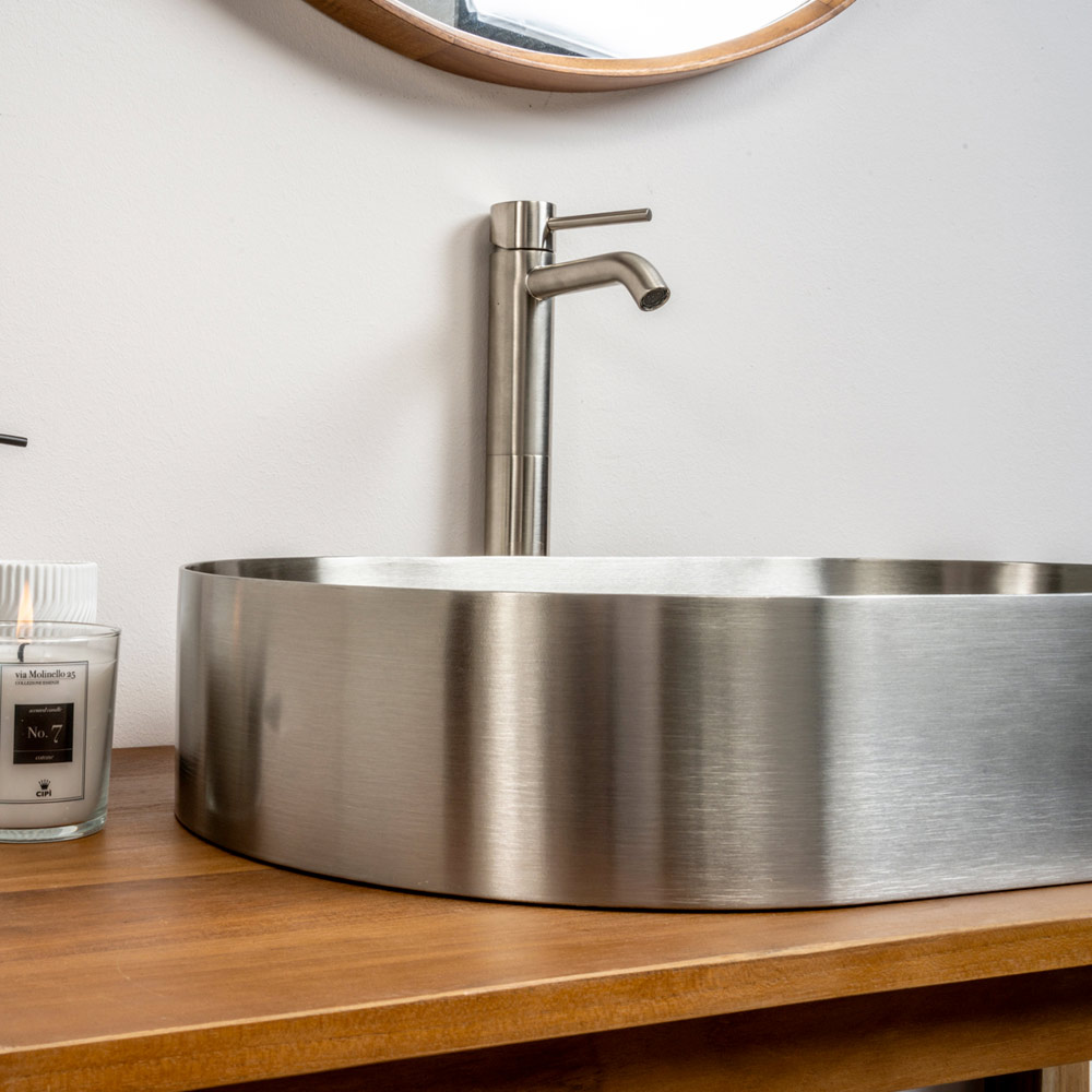 El fregadero sobre encimera ovalado en acero inoxidable SUS 304 de 3 mm es una joya de diseño y funcionalidad. Fabricado a partir de una única chapa de metal, ofrece una estética limpia y moderna. El tratamiento de acabado PVD+Nano , combinado con un meticuloso cepillado, confiere al objeto un aspecto atractivo y casi enigmático, realzando el brillo y la resistencia a las manchas y los arañazos. El diseño se caracteriza por formas equilibradas y proporciones ideales, disponibles en tres acabados que se adaptan elegantemente a cualquier ambiente. Además, detalles refinados como la tapa de drenaje coordinada incluida y la ausencia total de soldaduras visibles elevan este fregadero a una verdadera obra maestra de artesanía y diseño, convirtiéndolo en una pieza destacada para baños con un aire lujoso y contemporáneo .