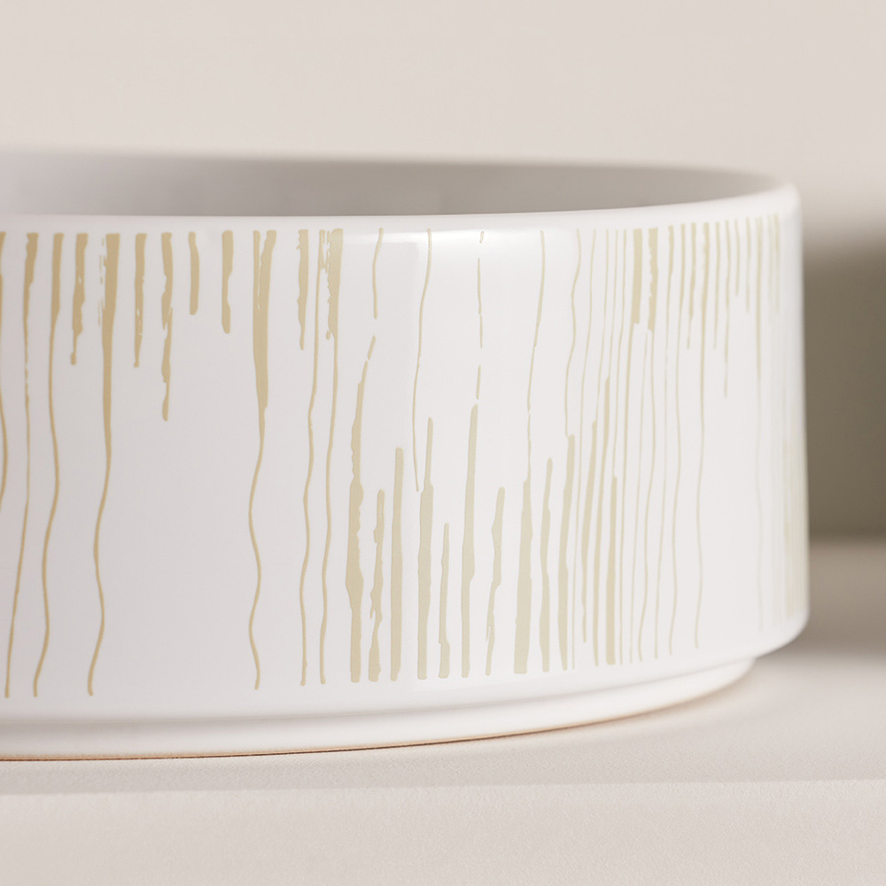 - Interior blanco brillante, exterior decoración en relieve de gota color crema sobre esmalte blanco mate.