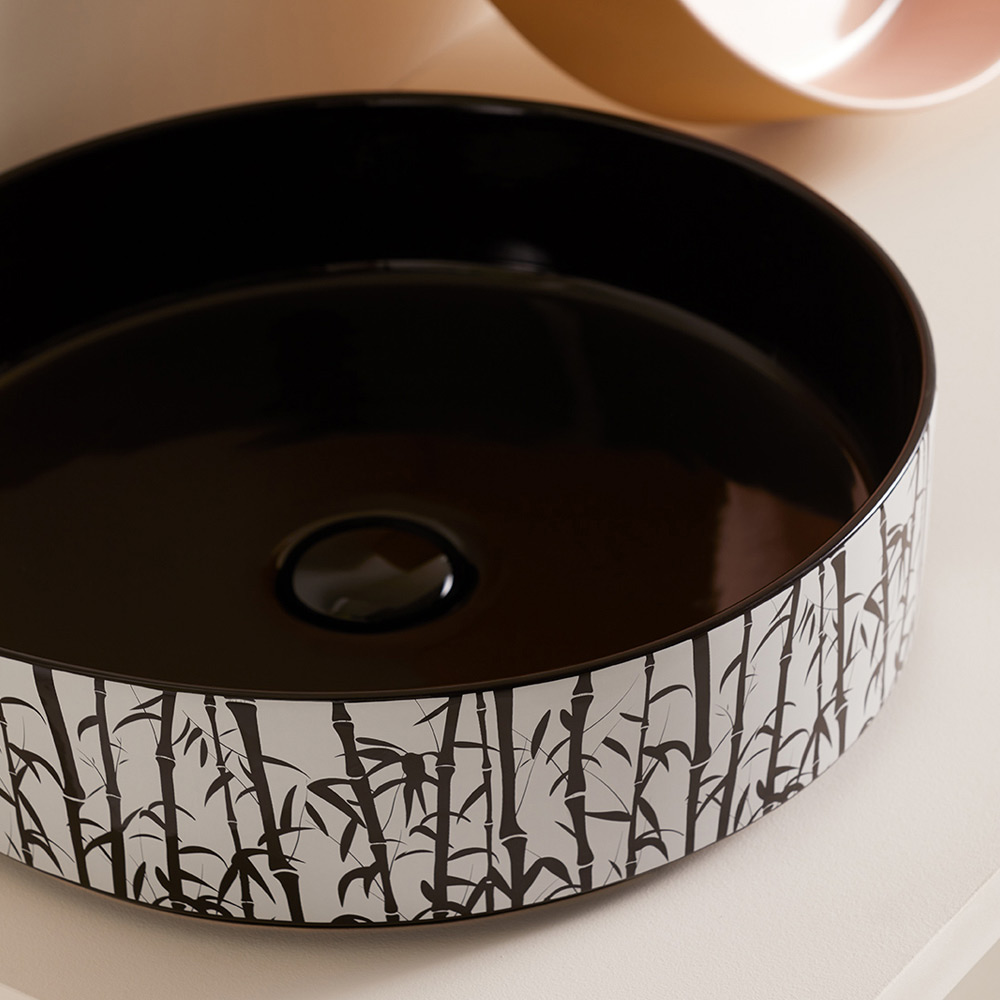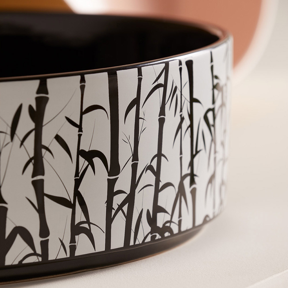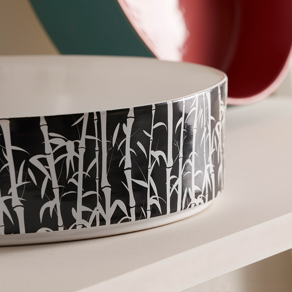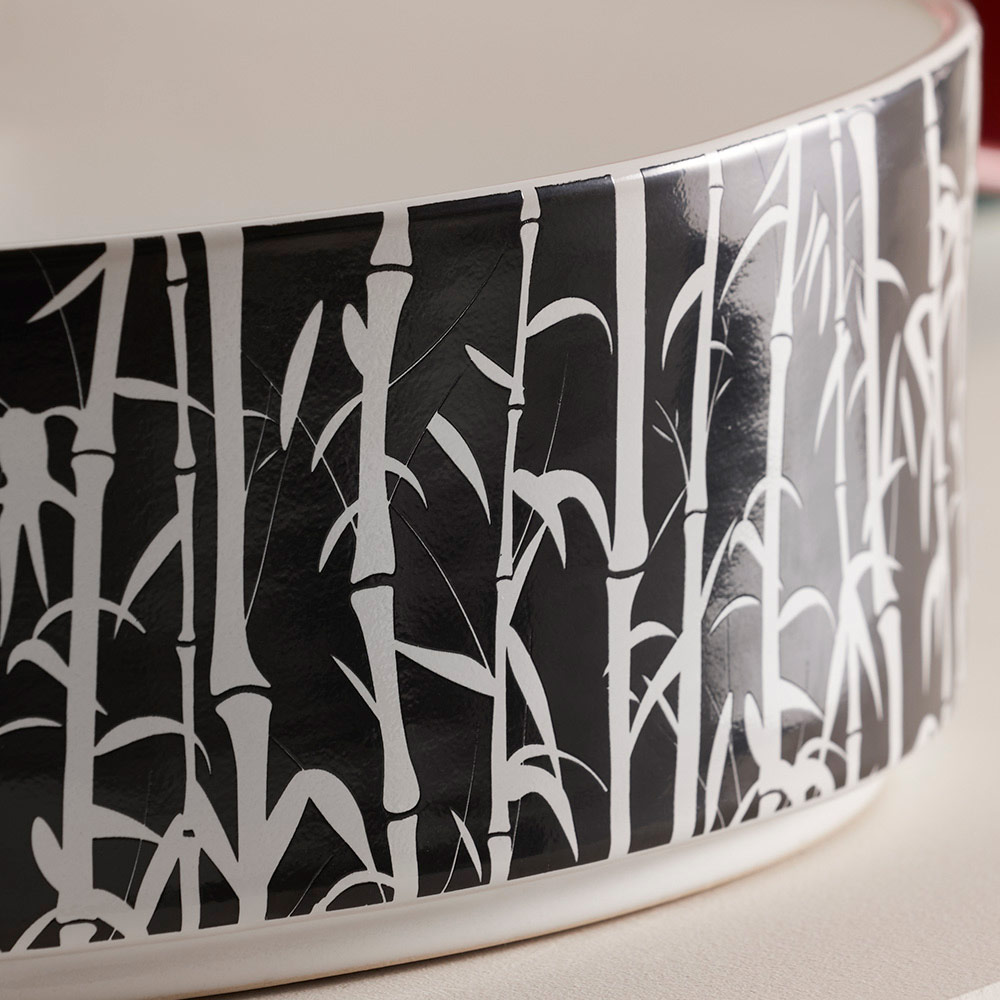 - Interior negro brillante, exterior decoración en relieve negativo blanco sobre esmalte negro mate (bambú negro)