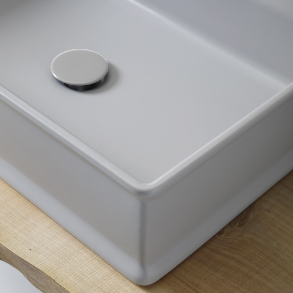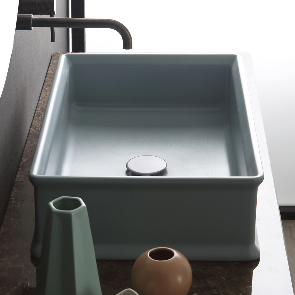 Lavabo sobre encimera rectangular fabricado en cerámica de color opaco a través de una artesanía 100% Made in Italy . Un diseño caracterizado por líneas y características fuertes e imponentes hace de este mueble una perfecta reinterpretación contemporánea de una estética con alma retro gracias al uso del color dando vida a un resultado exclusivo y refinado .