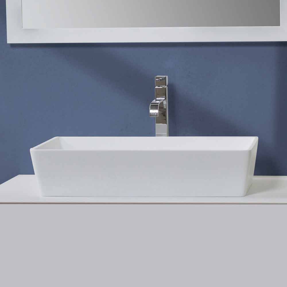 Lavabo sobre encimera rectangular en resina blanca óptica.