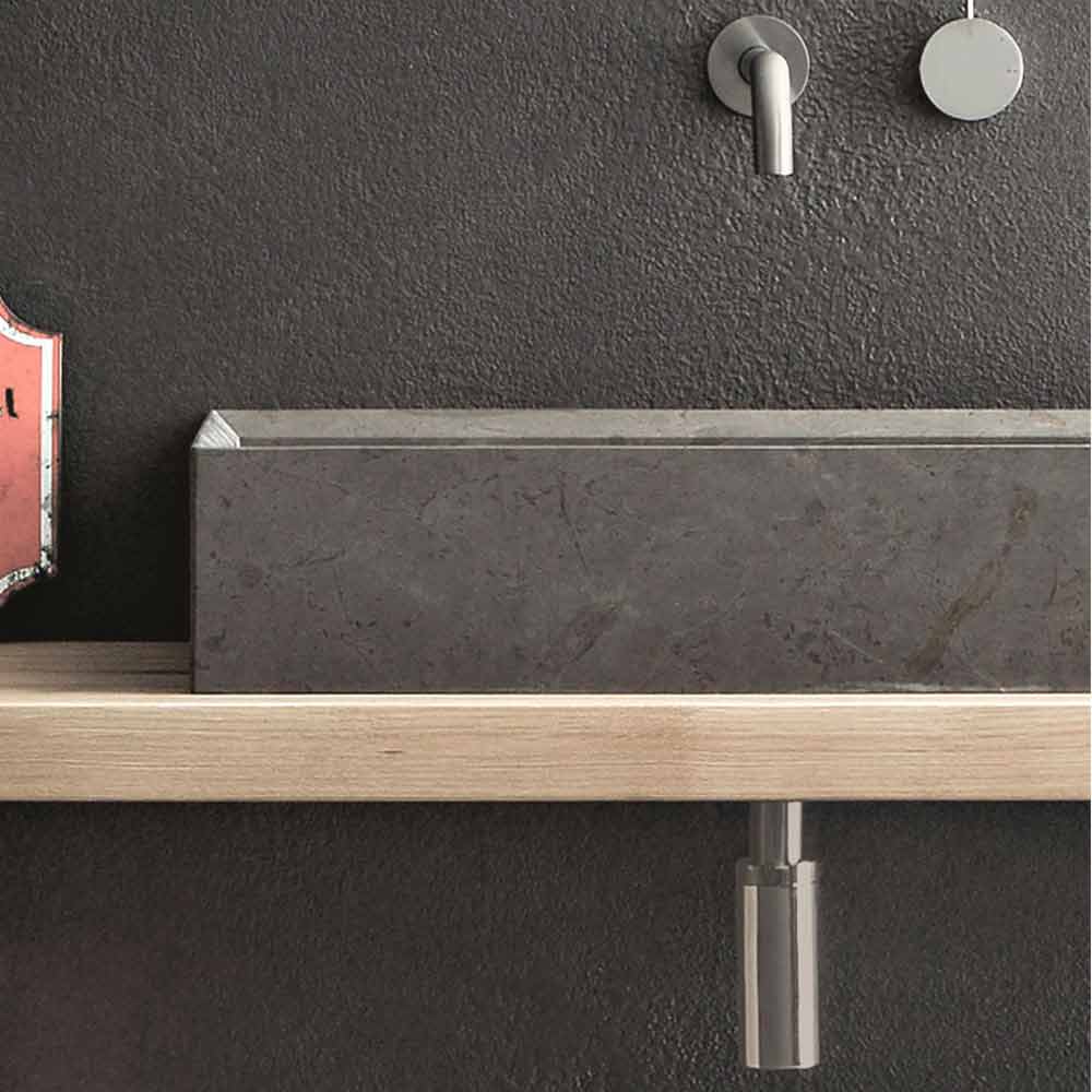 Lavabo sobre encimera rectangular, de diseño moderno en piedra natural, sin orificio de desagüe.